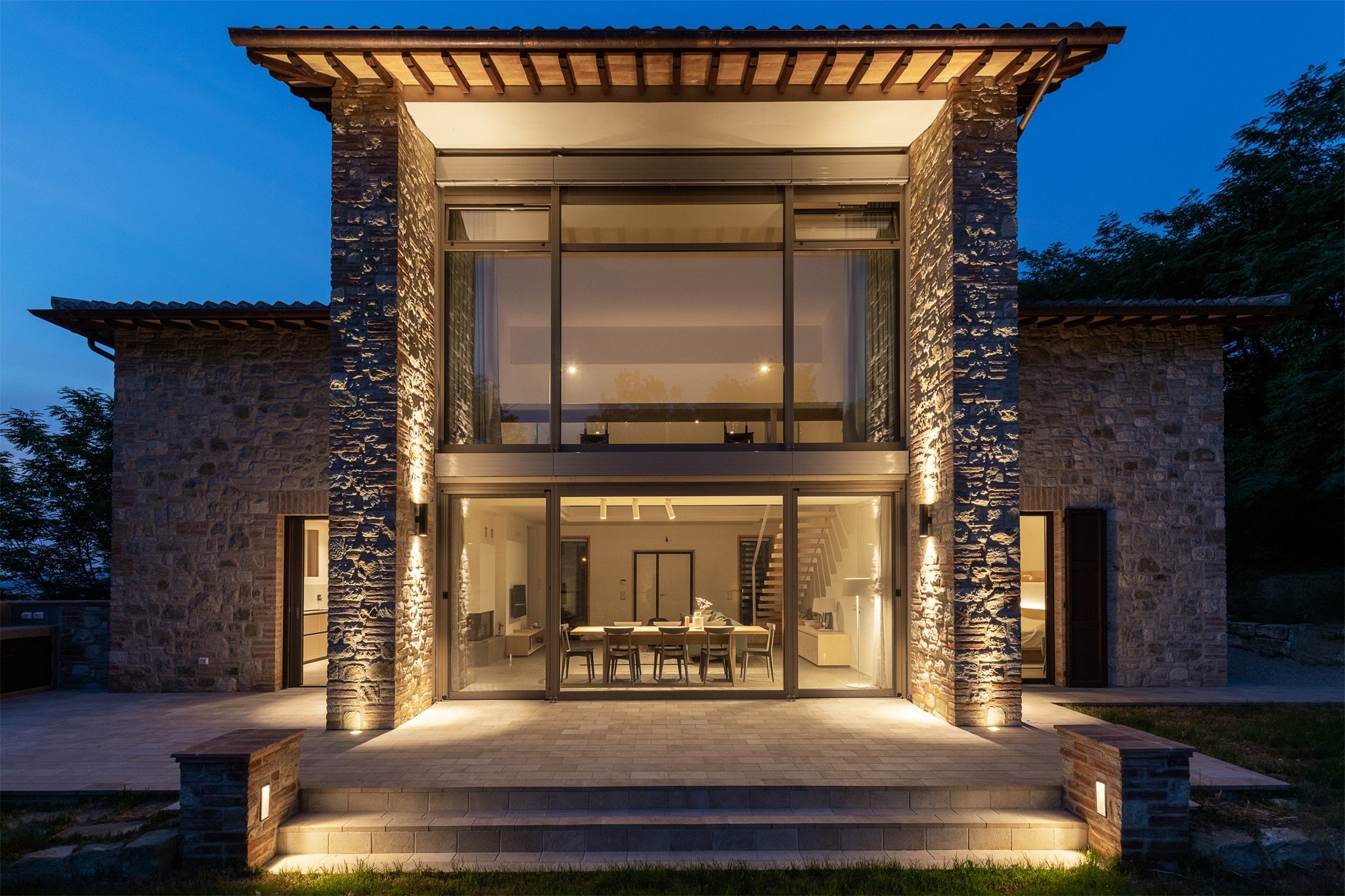 Siamo alle porte di Todi, cittadina medievale di una bellezza ed eleganza uniche, in un lotto che anticamente ospitava un poligono di tiro militare, ancora visibile nel caratteristico muro in pietra di fronte alla vecchia costruzione, elemento fortemente caratterizzante del progetto. E’ in questo luogo immerso nel verde, all’ombra del colle dove domina Todi e con la vista sulla vallata Perugina che la coppia italo-francese decide di stabilire la propria dimora estiva, nonché la casa deputata al relax, alla pace, al benessere.