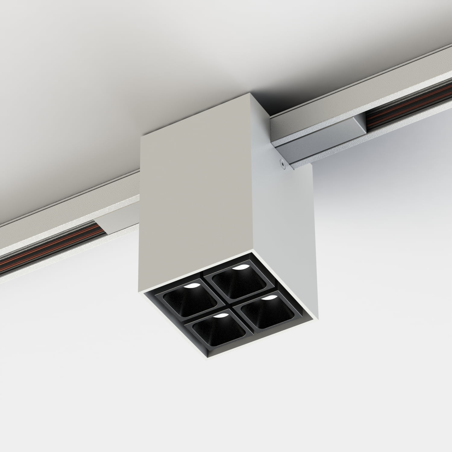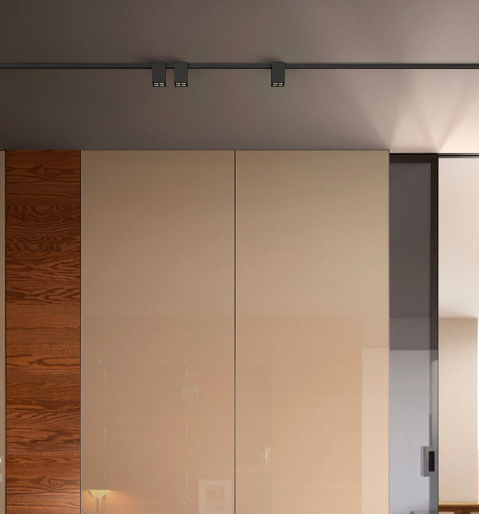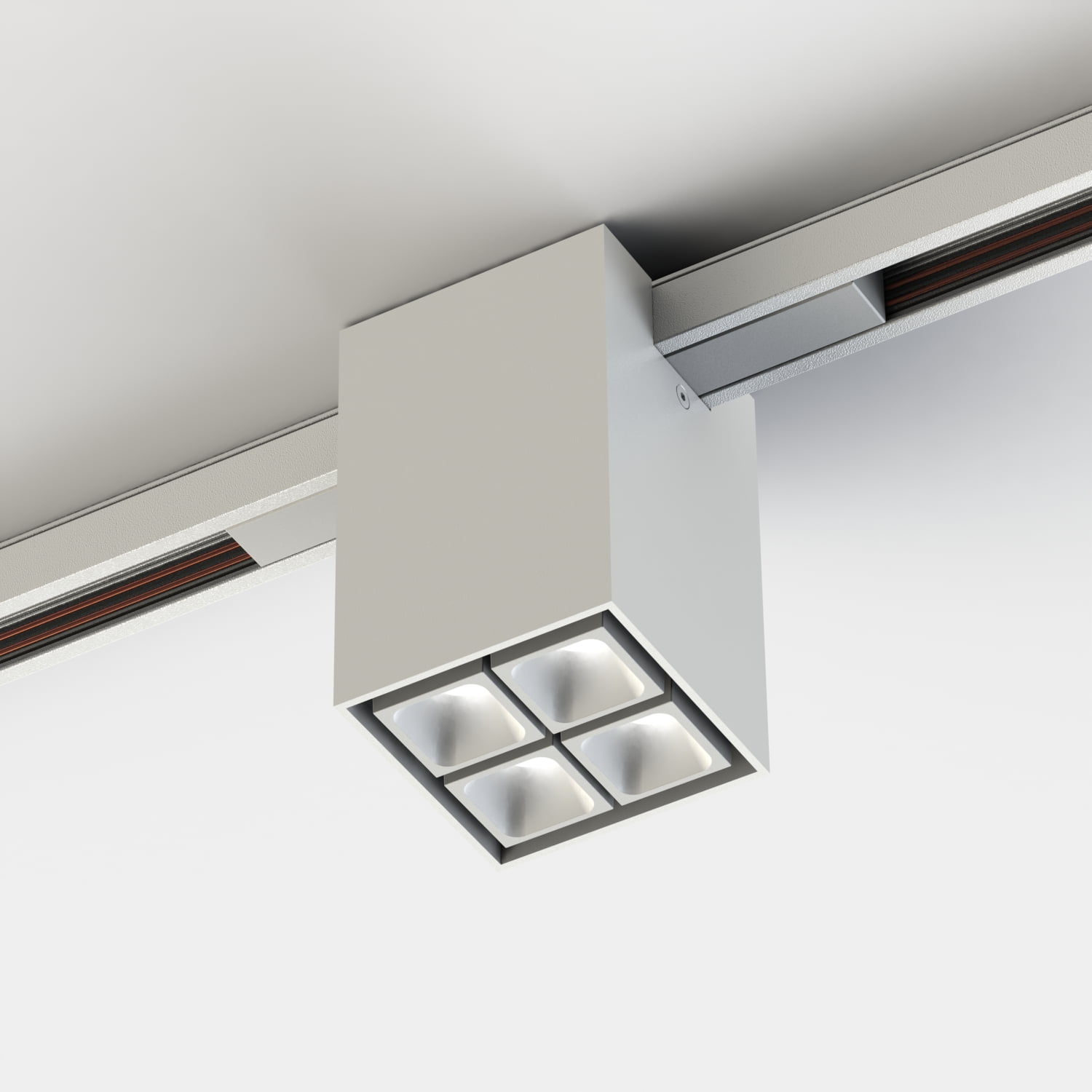 Collezione di apparecchi per un’illuminazione a binario 24V/48V. Apparecchi a luce diretta. Disponibili in versione da binario a soffitto o in versione per bianario da incasso per un'installazione filo muro. Corpo a sezione quadrata in estruso di alluminio in finitura verniciata. Grado di protezione IP20.