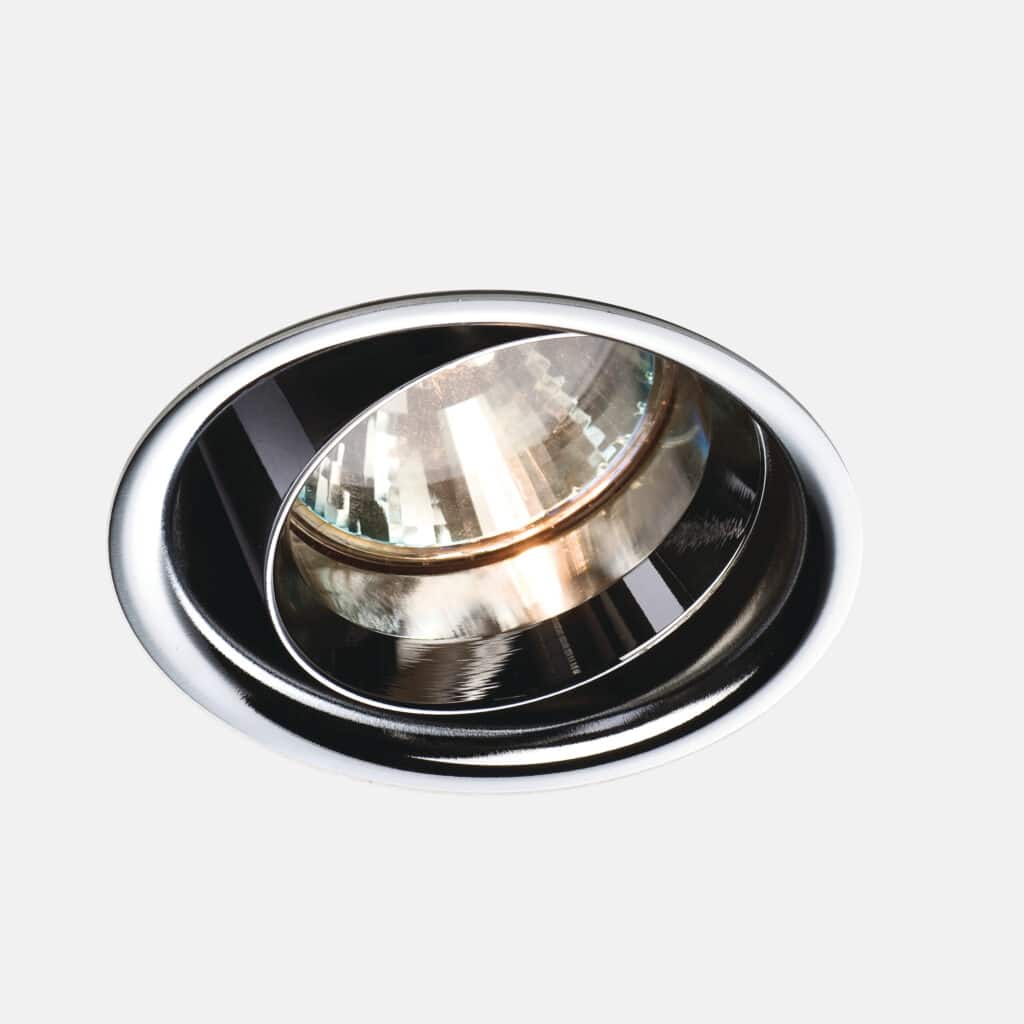 Indoor wall/ceiling recessed fixture for false wallor brickwork, direct light, round shape fixed or adjustable model painted or galvanized metal body and mechanical parts in steel wiring for low tension halogen lamp, metal halide HQI 35W (brite spot) for inspecting ceiling. With electronic or electromagnetic ballast by request version with form for concrete wall and ceiling.