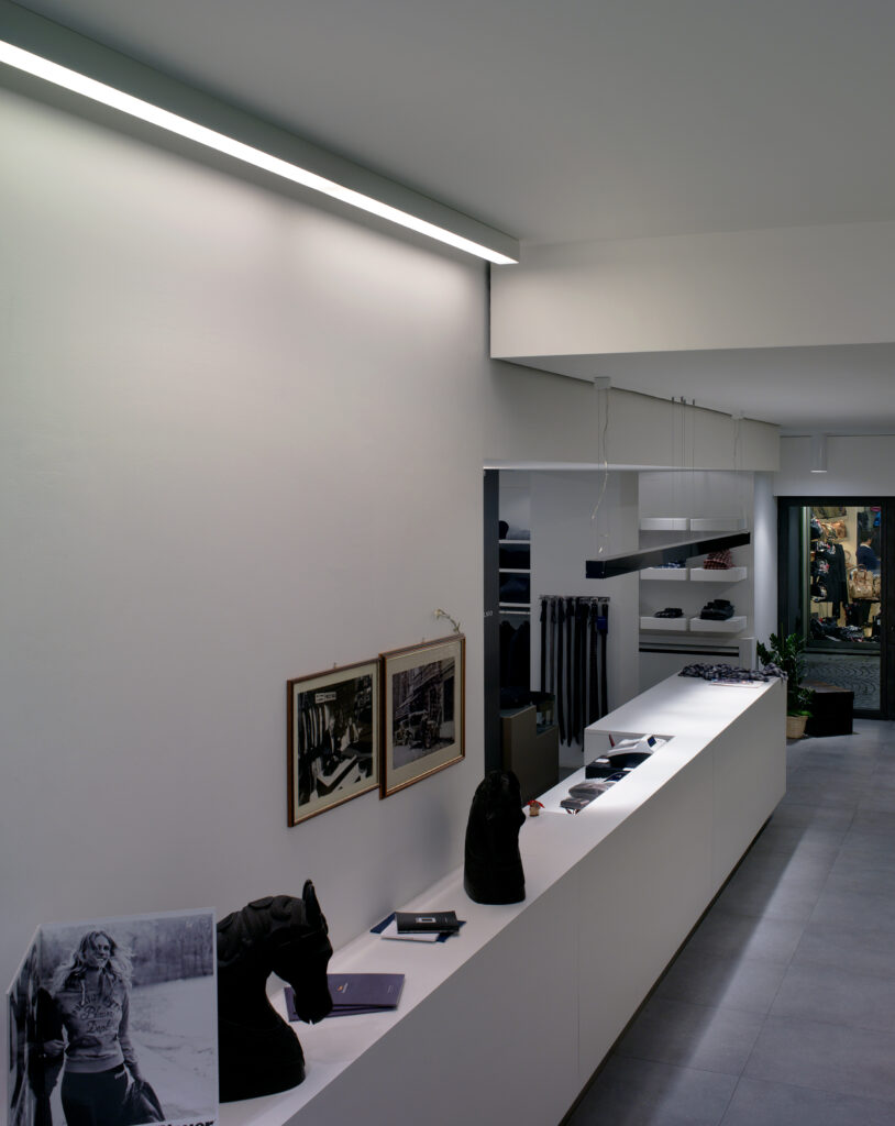 LED linear light sources, battens for T16 fluorescent lamps, recessed versions with built-in LED source or for QPAR16 halogen/LED lamps and max 16A 3-circuit track modules for inclusion of projectors. Fluorescent battens, complete with 50/60 Hz 230/240 V electronic power supply. LED batten with driver included. To be completed with side end caps with Light Proof system, opal white or microprismatic PC diffusing screen (in accordance with EN 12464-1), closing profiles, with a predefined length or cut to measure, or dark-light aluminium grille with high specular qualities and mounting brackets or suspension cables. IP40 protection rating.