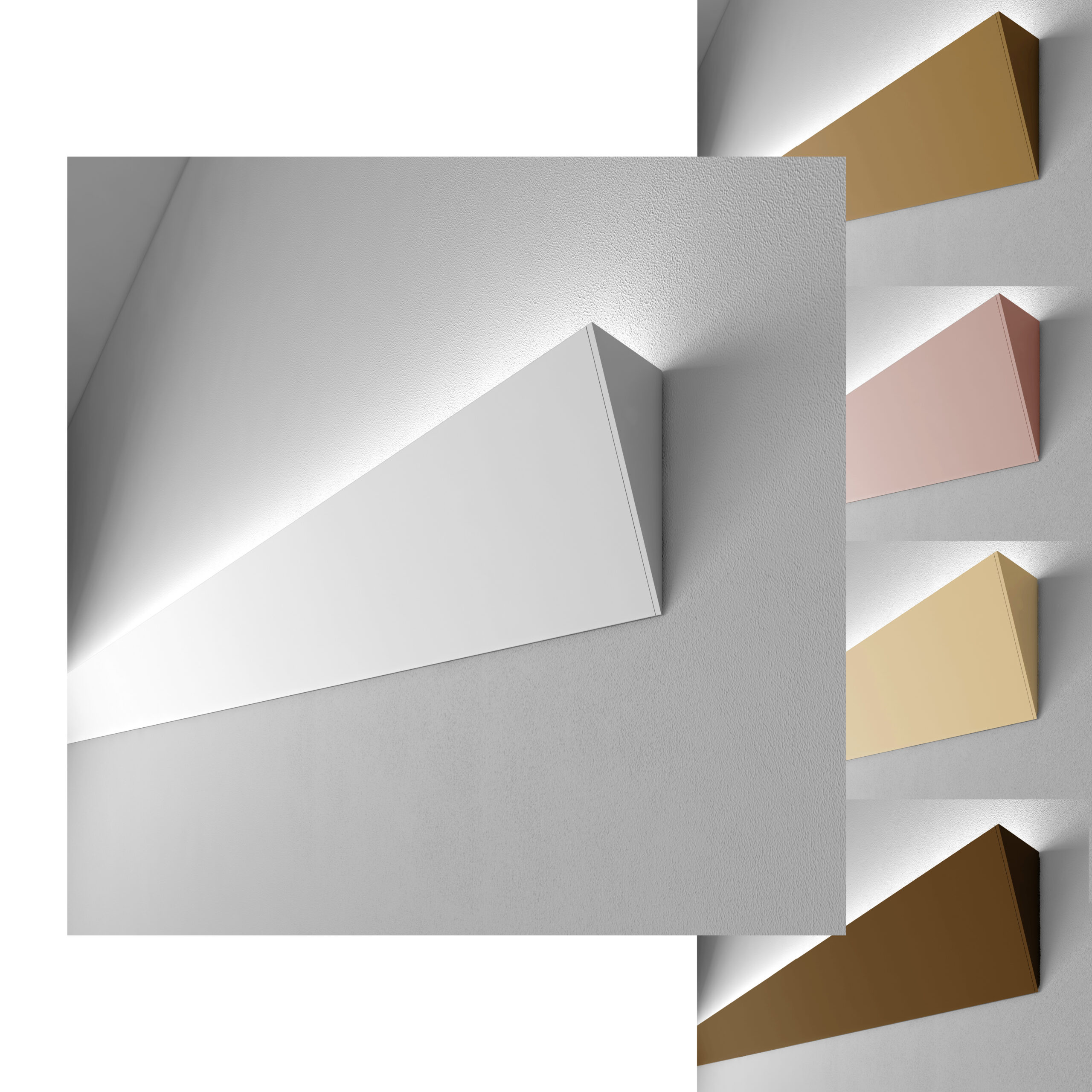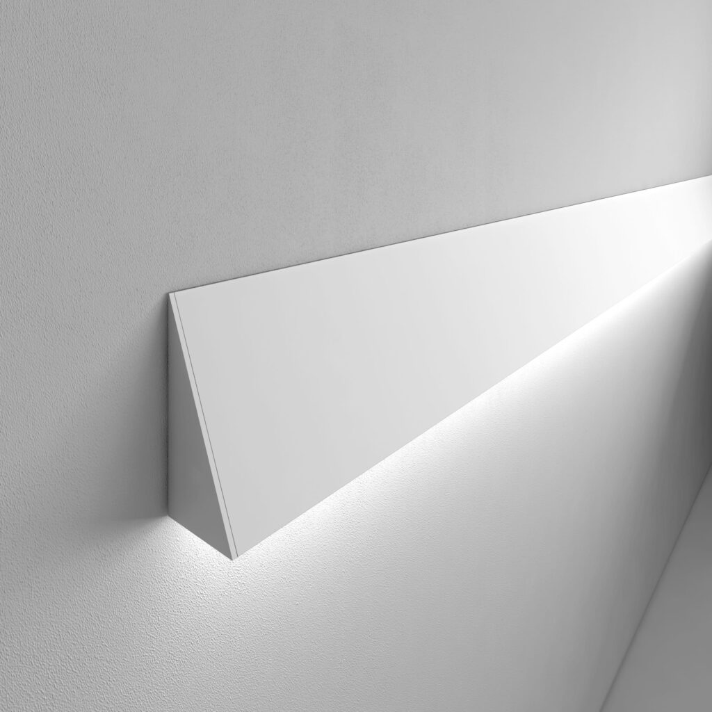 Series of wall-mounted fixtures for direct or indirect lighting, complete with integrated linear LED sources. To be completed with driver, to be installed remote. Body in extruded aluminium, painted finish. Double installation possibility: if fixed by the narrow side, the lighting effect is diffused, if fixed instead by the wide side, the lighting is grazing. Complete with Light Proof system side-end caps, opal white polycarbonate diffuser and mounting brackets. IP65 Degree of protection.