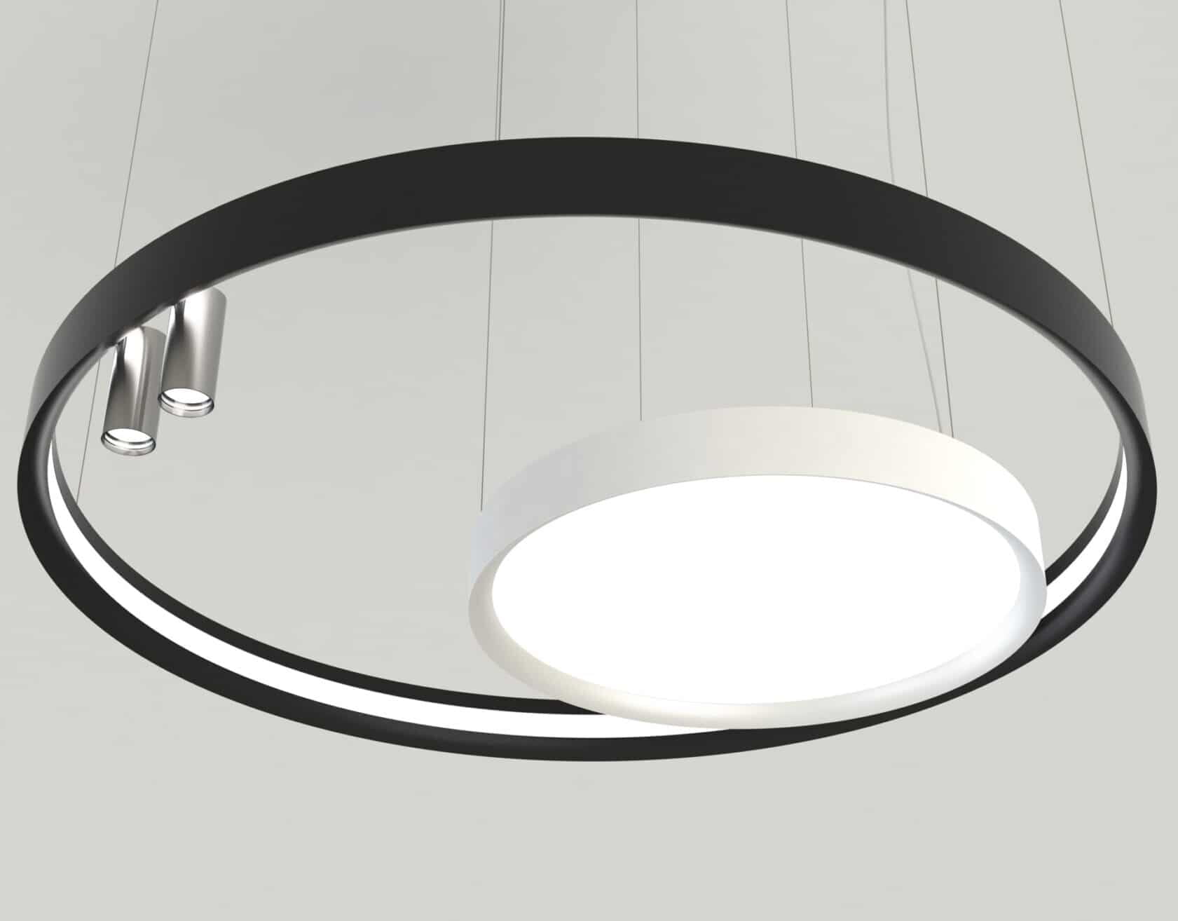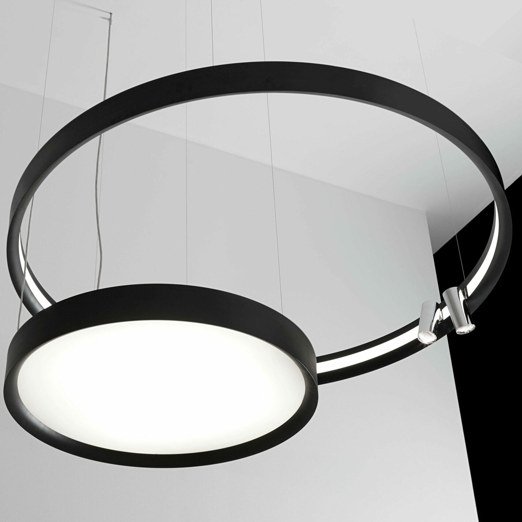 Extruded aluminum curved profiles programme. Profile dimensions: 90 x 30 mm and radius 367 mm – 517 mm – 667 mm Available in round suspended, ceiling-mounted and trimless recessed versions (default modules), in arc-shaped wall-mounted version (default module), or as modules to assemble together to form a sinusoidal system, ceiling-mounted or suspended. Available with the following lighting emissions:horizontal from the internal or external side of the profile, direct/diffused and indirect, provided by strip led (driver to be installed remote in a separate ceiling canopy or onto the false-ceiling) or by led batten with integrated driver (on direct/diffused lighting emission only). Opal white polycarbonate diffuser. The profile can be integrated with chip on board led adjustable projectors (remote driver), to be hung to the on the profile. Degree of protection IP40/IP43.