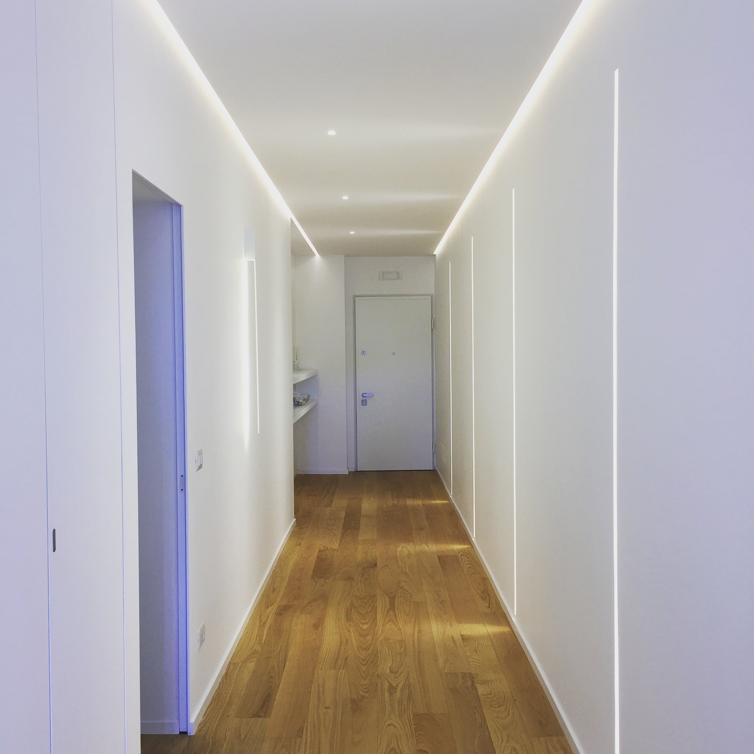 Modular system for direct, diffused, accent or wallwasher, made of 62×32 mm painted or anodised extruded aluminium empty profiles, available in predefined lengths or cut to measure. Available in wall-mounted, ceiling-mounted, suspended, trimless recessed or recessed with super-slim 5 mm. width edge trim versions. To be integrated with linear LED sources, LED spotlights, complete with 50/60 Hz 230/240 V electronic power supply. To be completed with Light Proof system side end caps, opal white polycarbonate diffusing screen, quick mounting extruded aluminium shapers (for linear LEDs and spotlight LEDs) or closing profiles, available in predefined lengths or cut to measure, and mounting brackets or suspension cables. IP20 or IP40 protection degree depending on the selected lighting combinations.