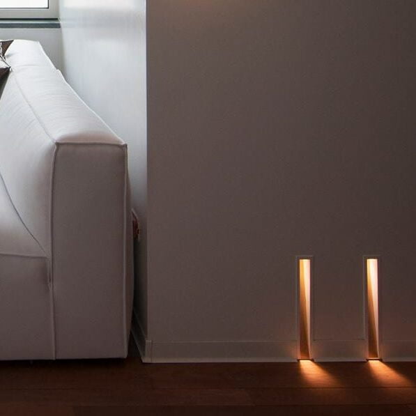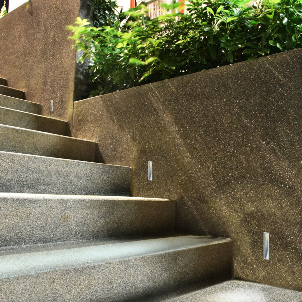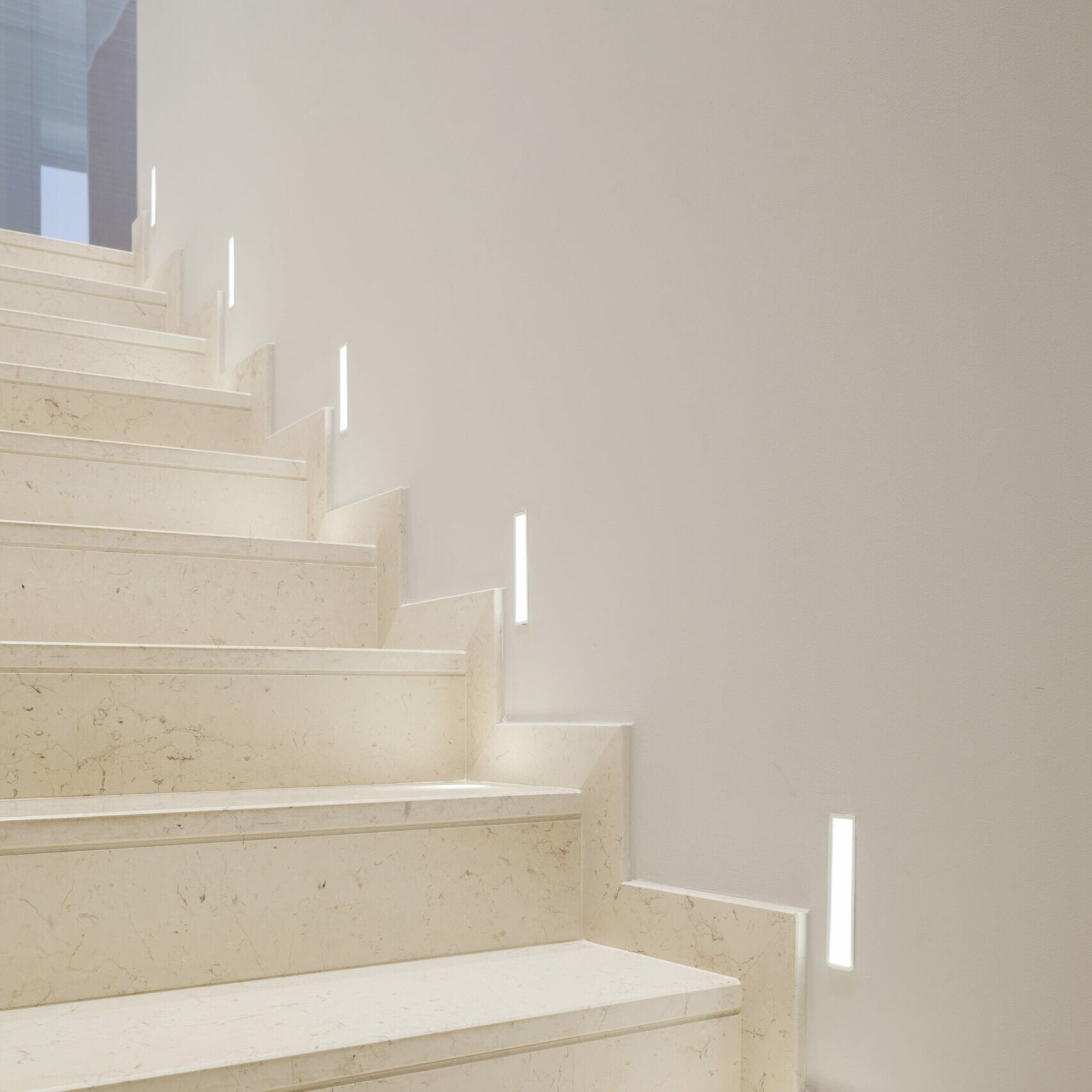 Recessed wall luminaire for path lighting with 20 ° angle, for integrated LED source with remote power supply available as accessory. Body and frame in painted metal. It can, also, be installed in concrete or brick ceilings using a special galvanized metal outercasing available as accessory. IP20.