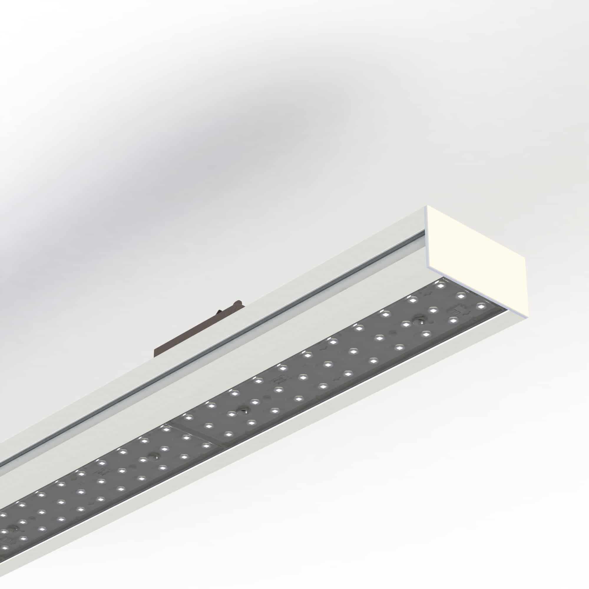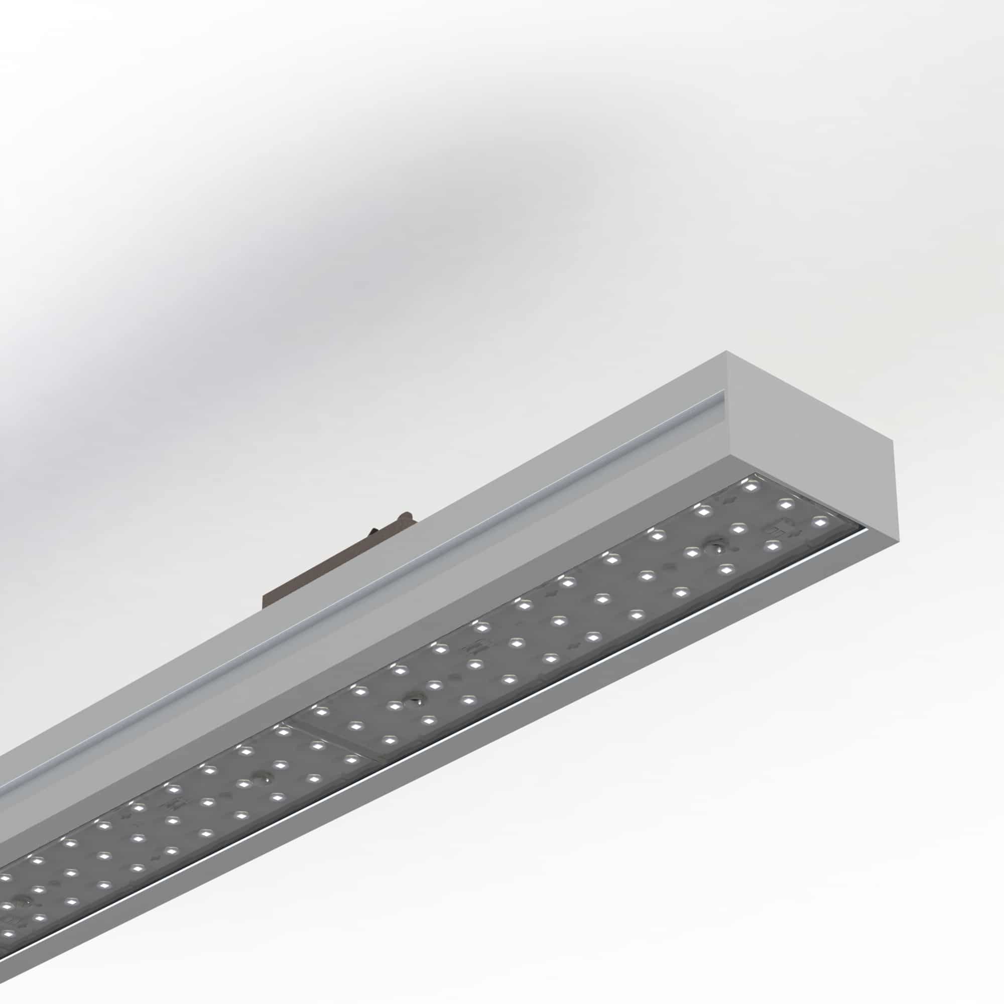 Collezione di apparecchi illuminanti lineari in estruso di alluminio 98mmx48mm. Possibilità di installazione a binario trifase elettrificato 230V o a sospensione con cavi a regolazione micrometrica, completo di bilanciatore orizzontale del prodotto. Finitura verniciatura a polvere. Ottiche ad alta efficienza professionale in policarbonato con diverse aperture di fascio. Grado di protezione IP40.