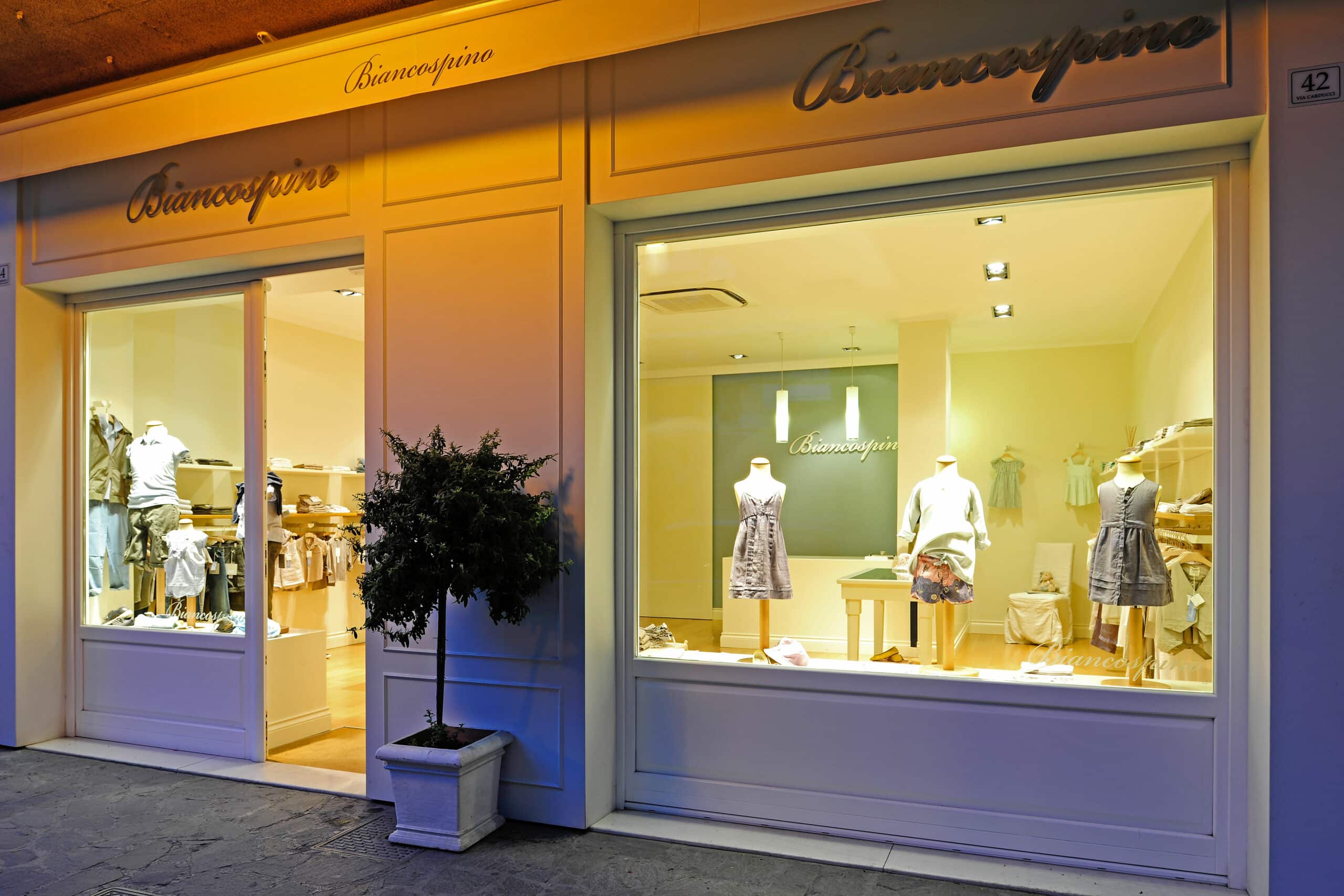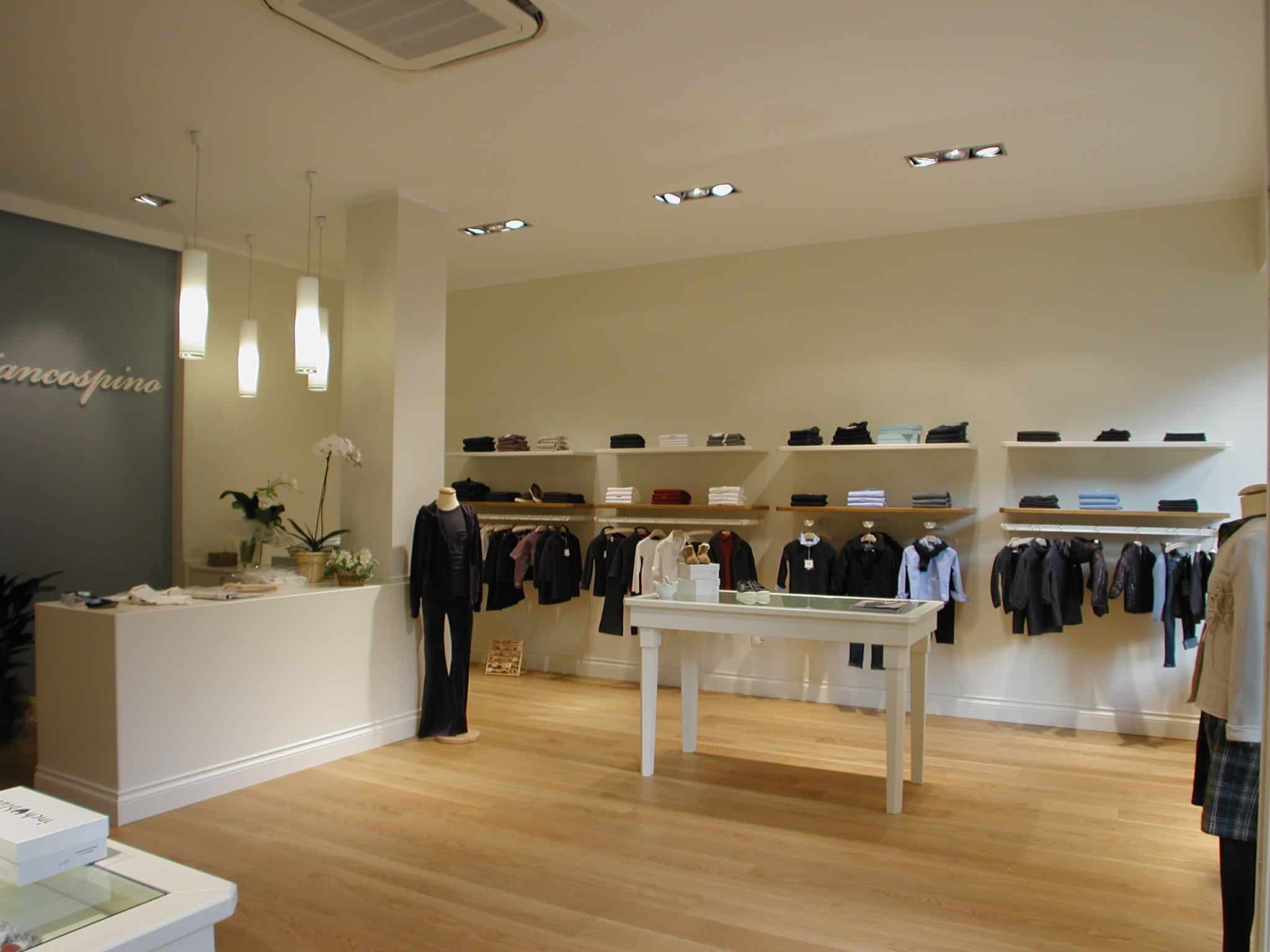 Biancospino is a boutique for children from zero to sixteen, furnished with taste and simplicity, displaying simple and elegant fashions. General lighting is provided by recessed INCAS fittings and SCENE suspensions give a touch of airiness that is particularly well-suited to the warm and basic ambiance of the shop.