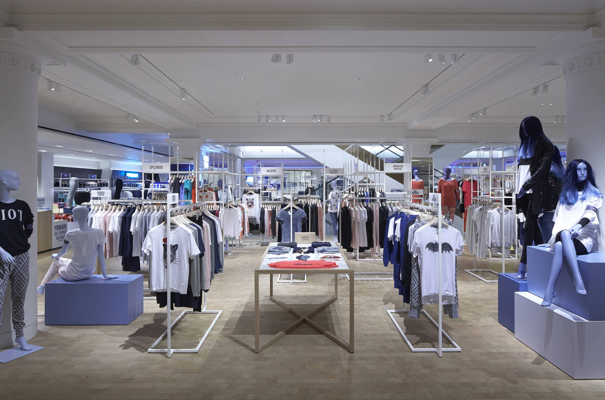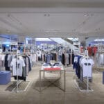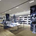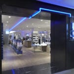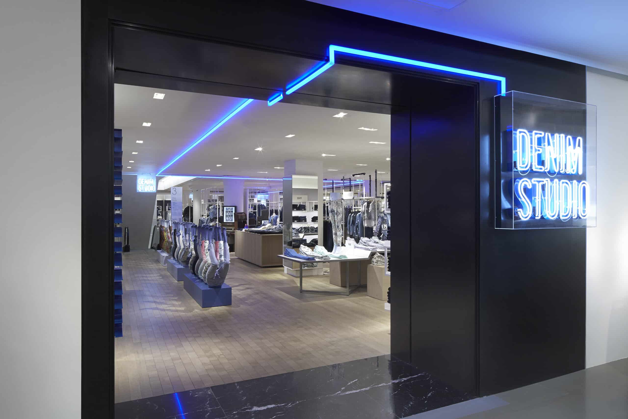 A line of blue light travels from the blue neon entrance signs across the ceiling, drawing customers into the department and through to the Fit Studio at the rear of the space. [...]