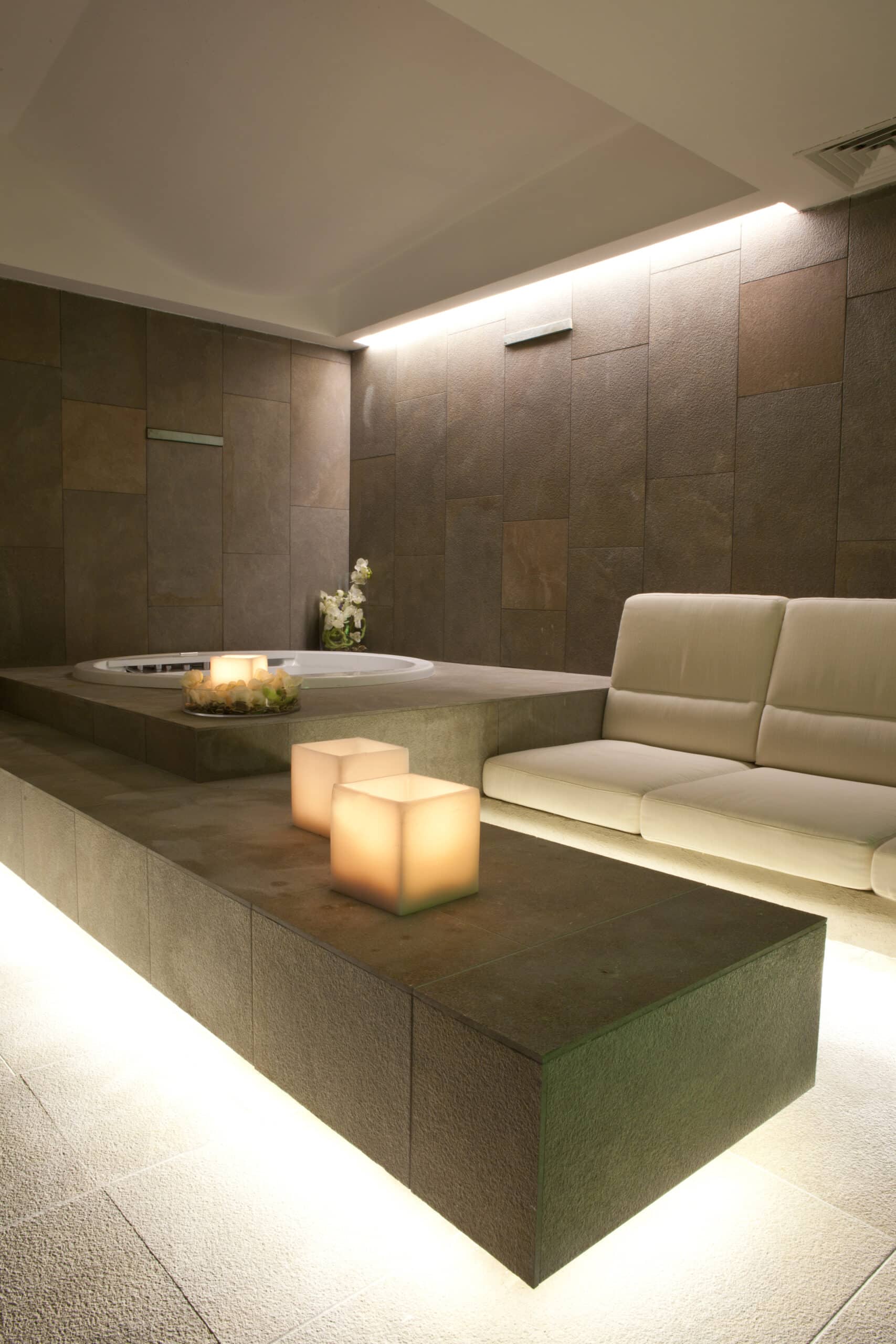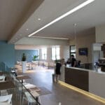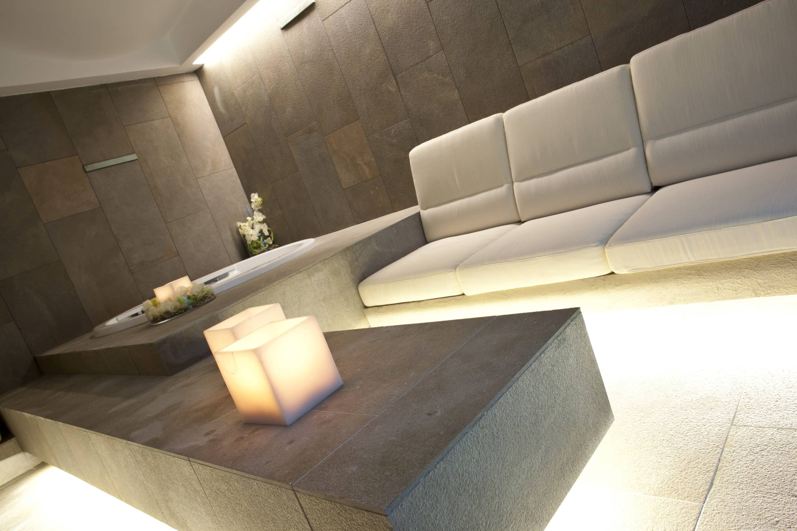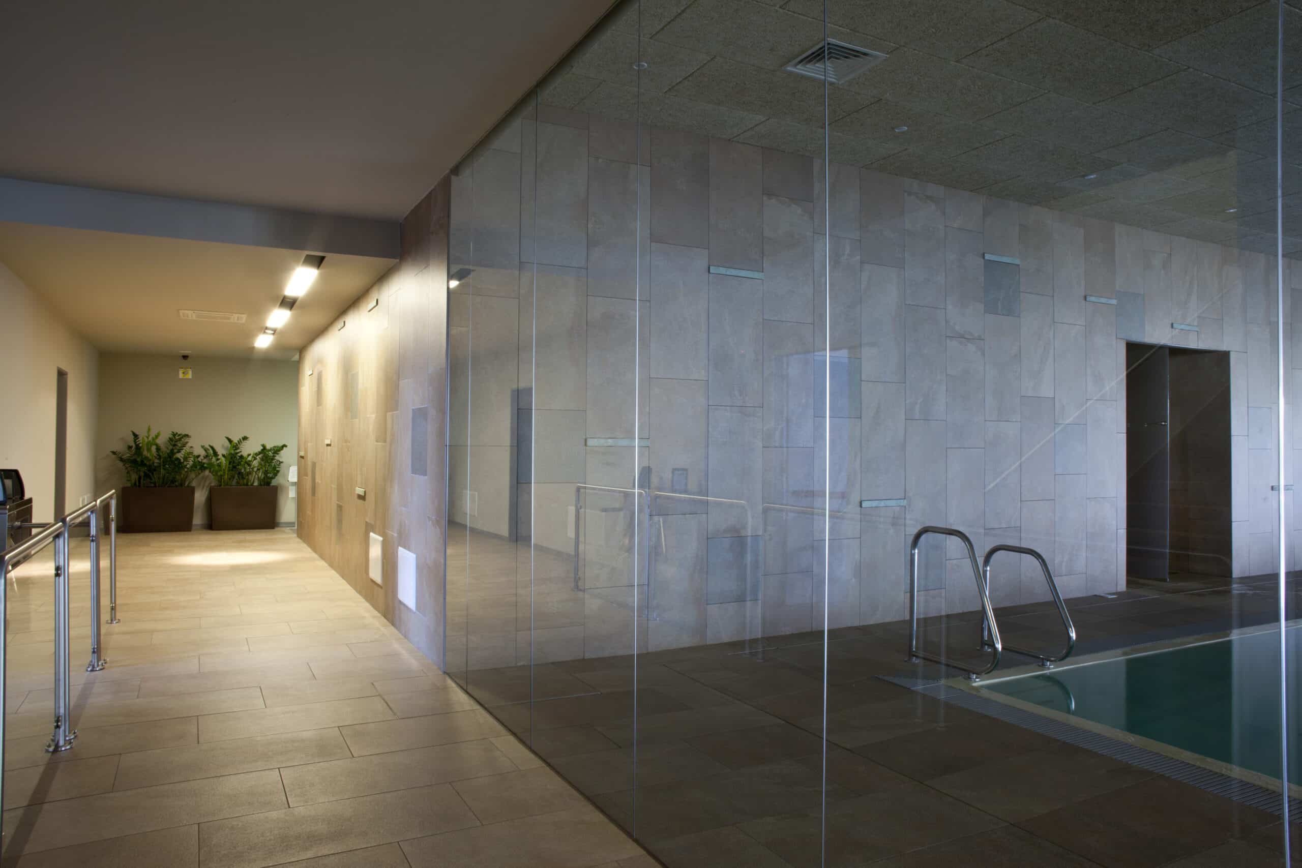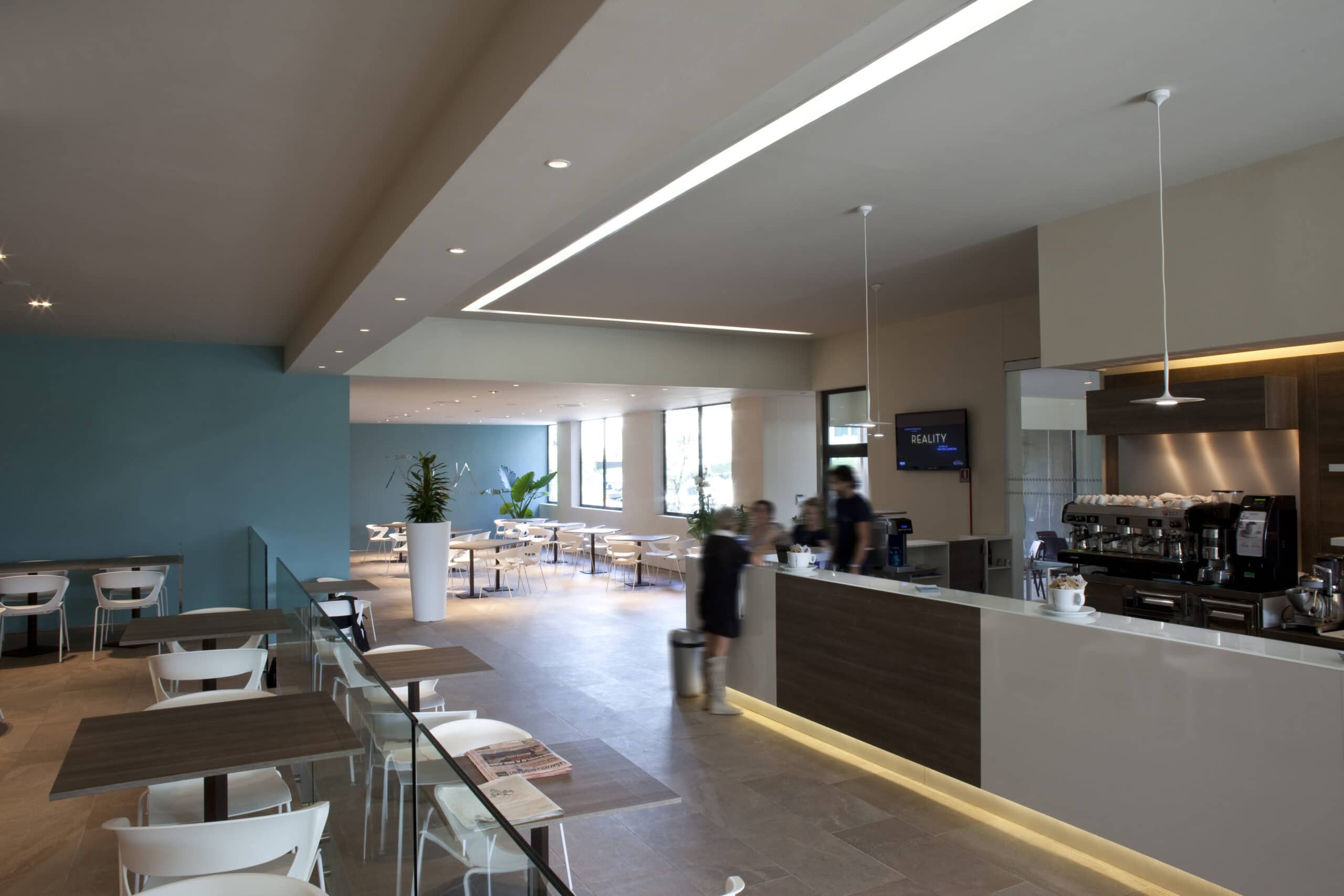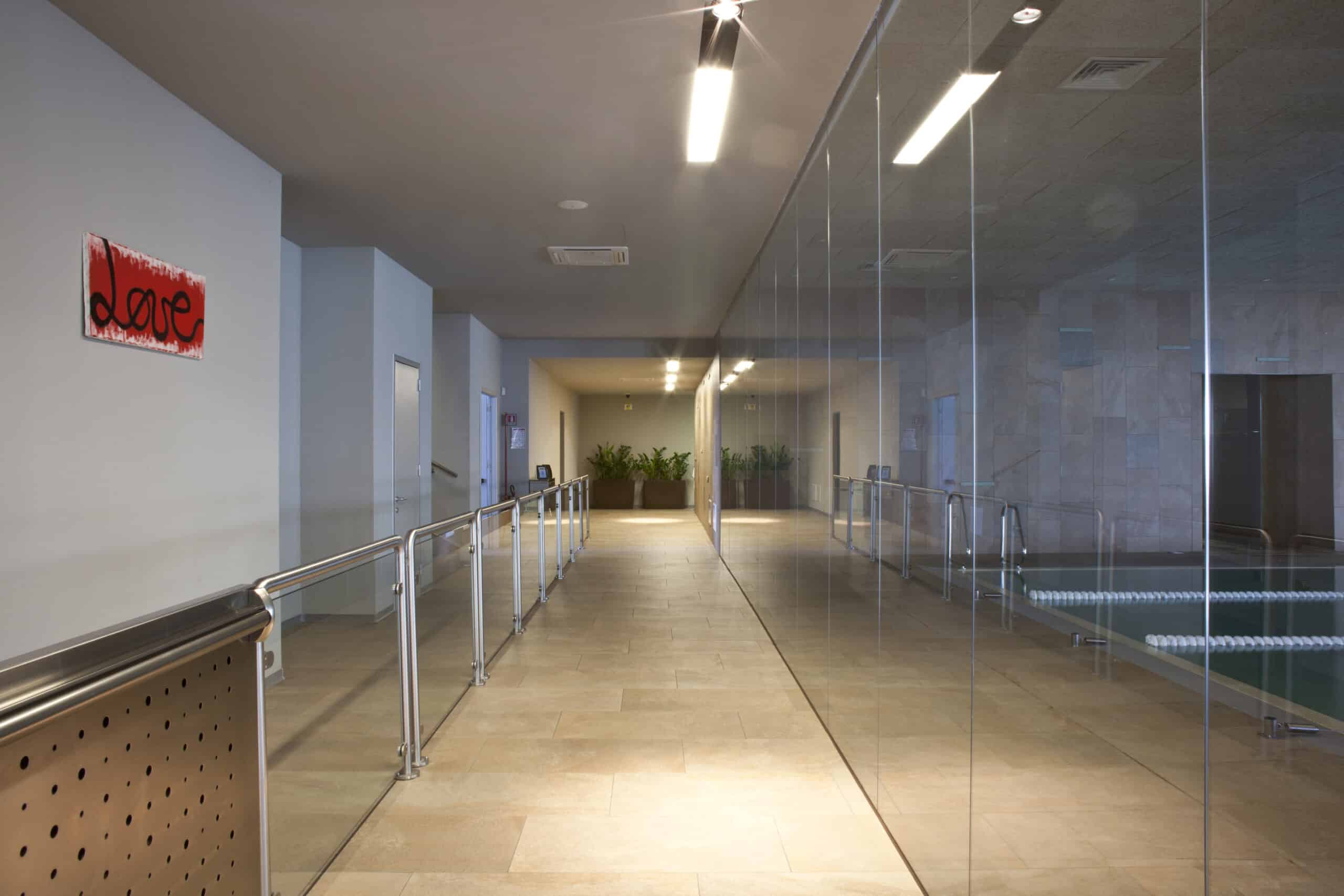 Hidron is situated in Pistoia. It is a world of 3,600 square meters, designed to make you live the experience of well-being. Four swimming pools, a fitness room, a beauty area and a spa, which offers you whirlpools, saunas, showers and relaxation room. Shops, restaurant and bar and hair-stylist. The products BKK and the modular system of the model GUIDE fluorescent version or mixed-version fluorescence and halogen lighting the different spaces of the center.