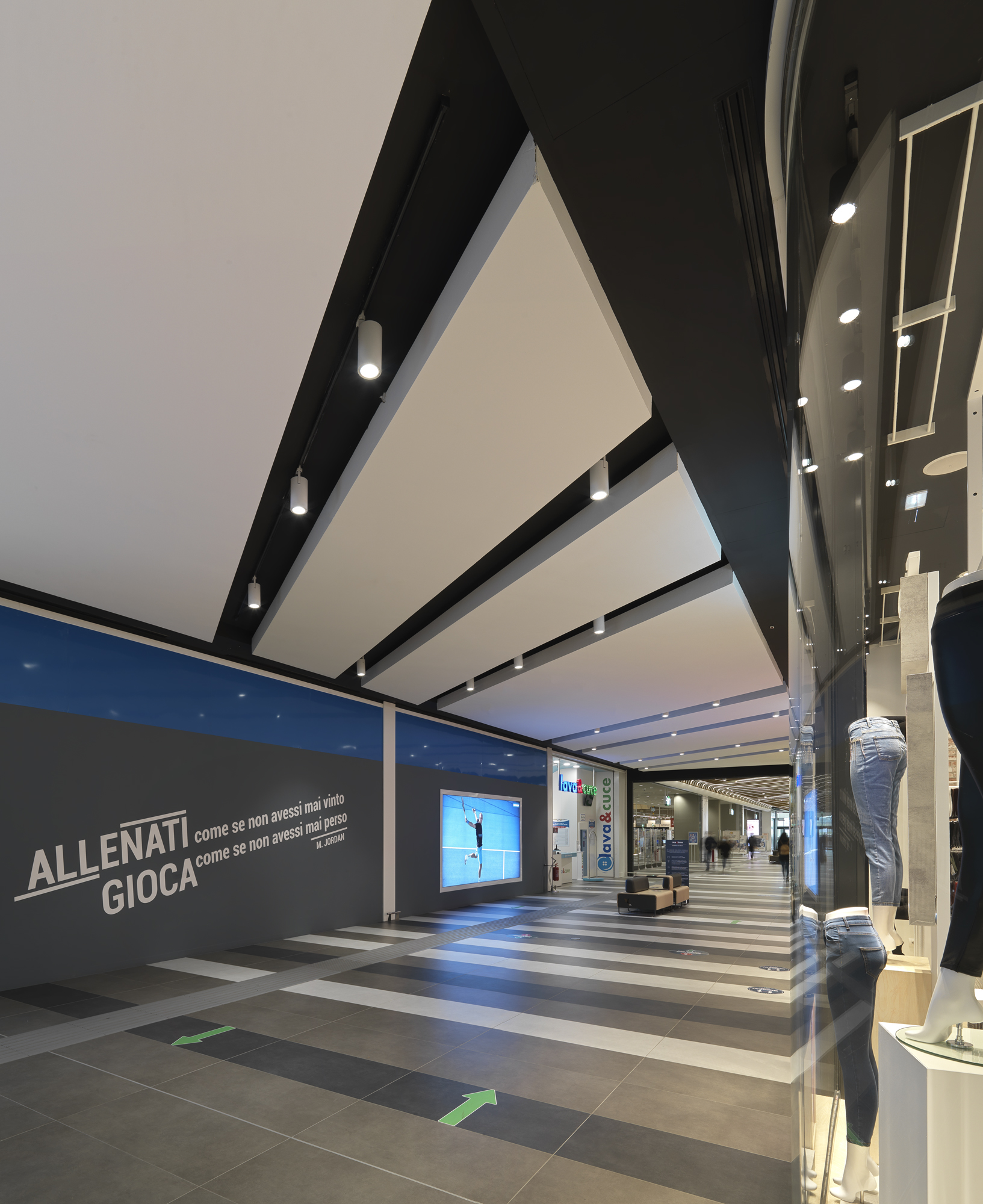 Maximo is an iconic project, located in a densely populated neighborhood in the urban area of Rome. A multi-storey structure, with large galleries, a commercial offer that includes multiplex cinemas, the latest generation gym, leisure facilities as well as a food court and garden food with fast and traditional catering formulas. This is combined with a diversified and exclusive shopping offer. 65,000 m2, 160 units, 1 hypermarket, 12 specialized medium-sized areas, over 40 bars and restaurants, luxe multiplexes, gym, games room, 3 floors. The Twenty7 LED series fixtures installed on the very high ceiling beams ensure general, targeted and diffused lighting. Adjustable luminaires were chosen to contrast the inclination of the ceiling planes and allow the right pointing to the required areas and situations, at the same time allowing penetration down to the lower floors. In the areas of the corridors and galleries, within a suggestive geometric effect, Semplice projectors are used, now in the version with base, now mounted on a track according to need, while Nyx recessed luminaires are positioned along the perimeter walkway in the fixed LED version which integrate the general lighting close to the spaces of the individual brands. The flush recessed File profiles and Minifile in the wall version were used in the car park entrance areas.