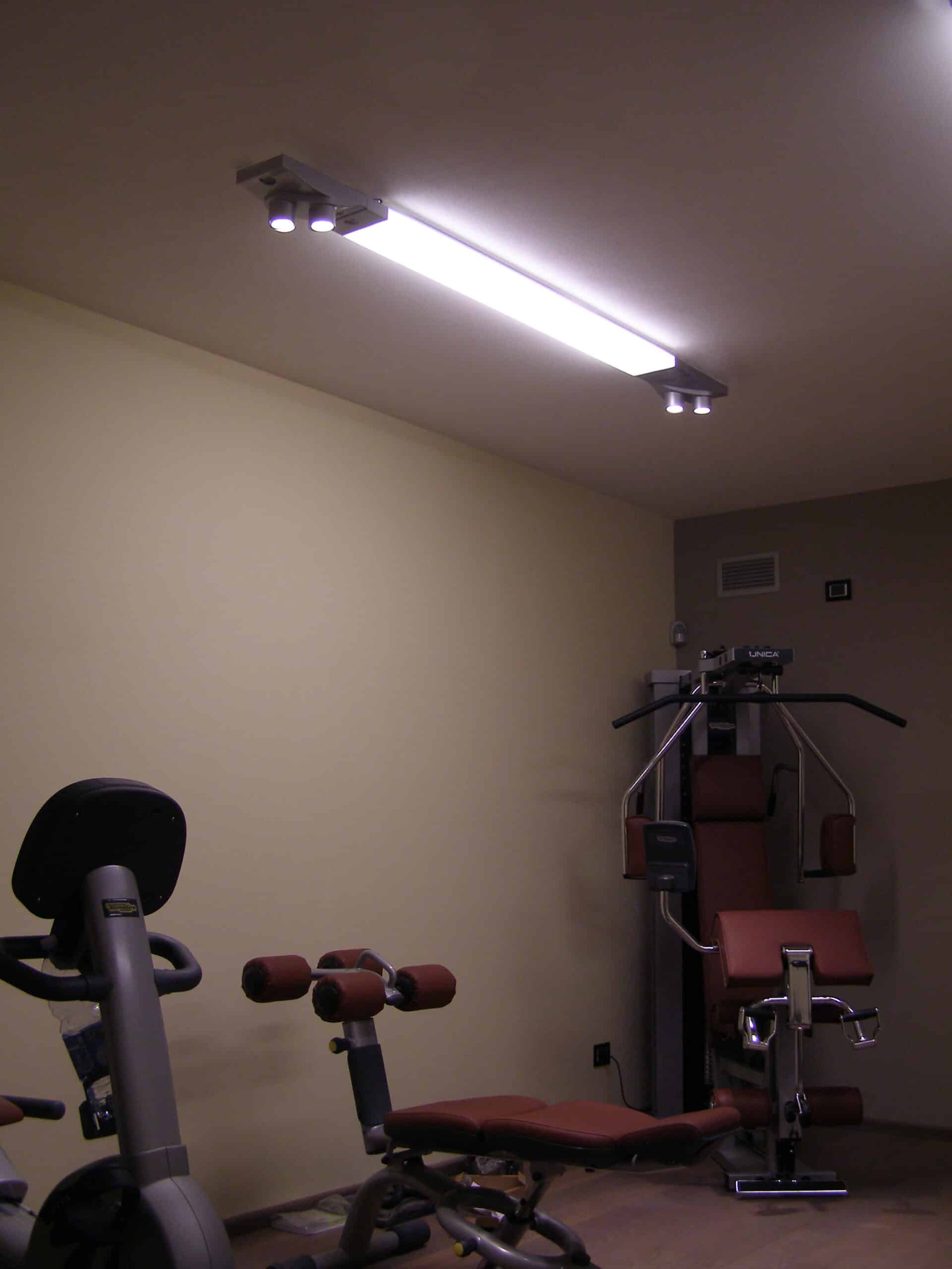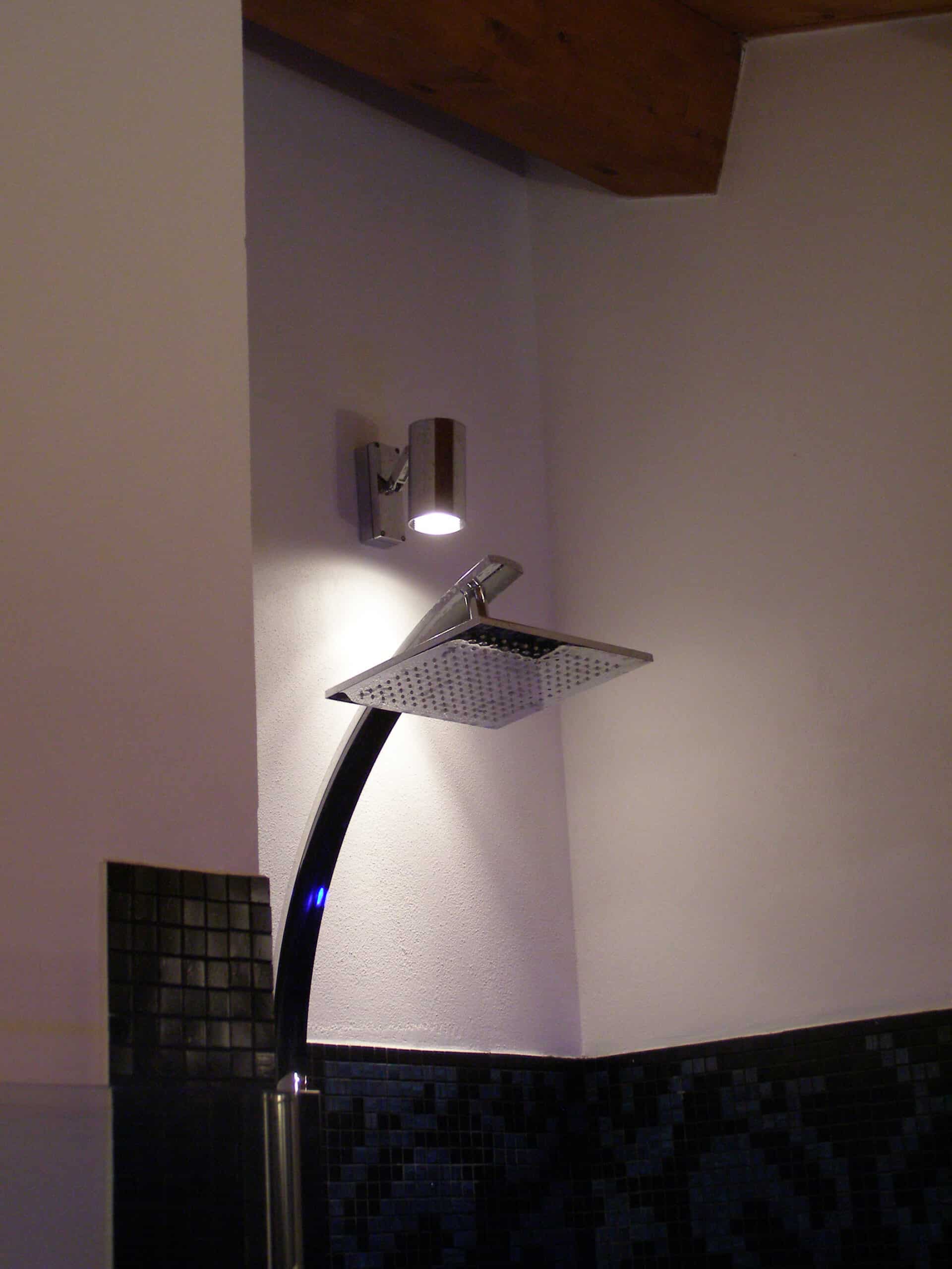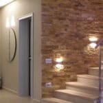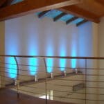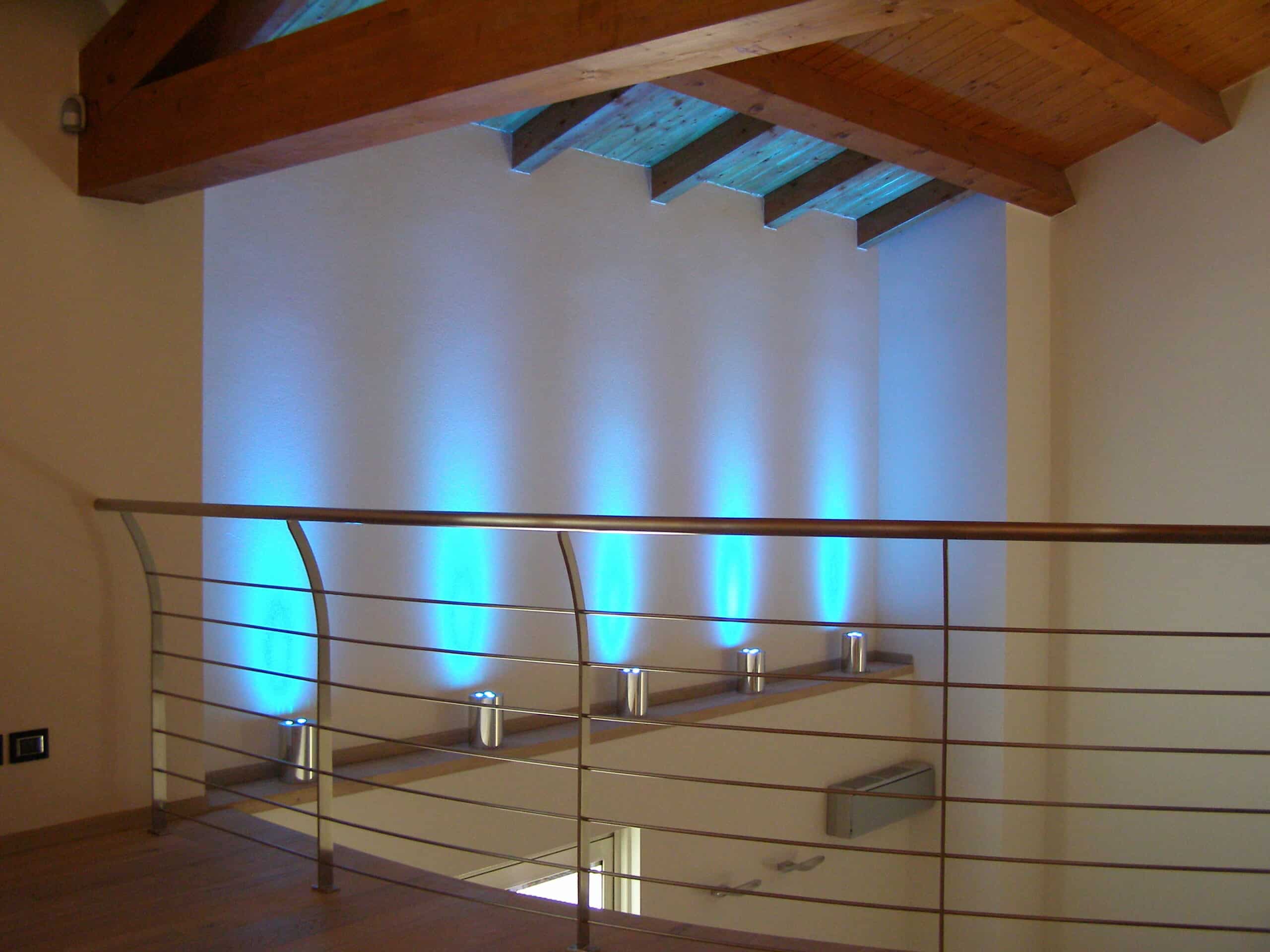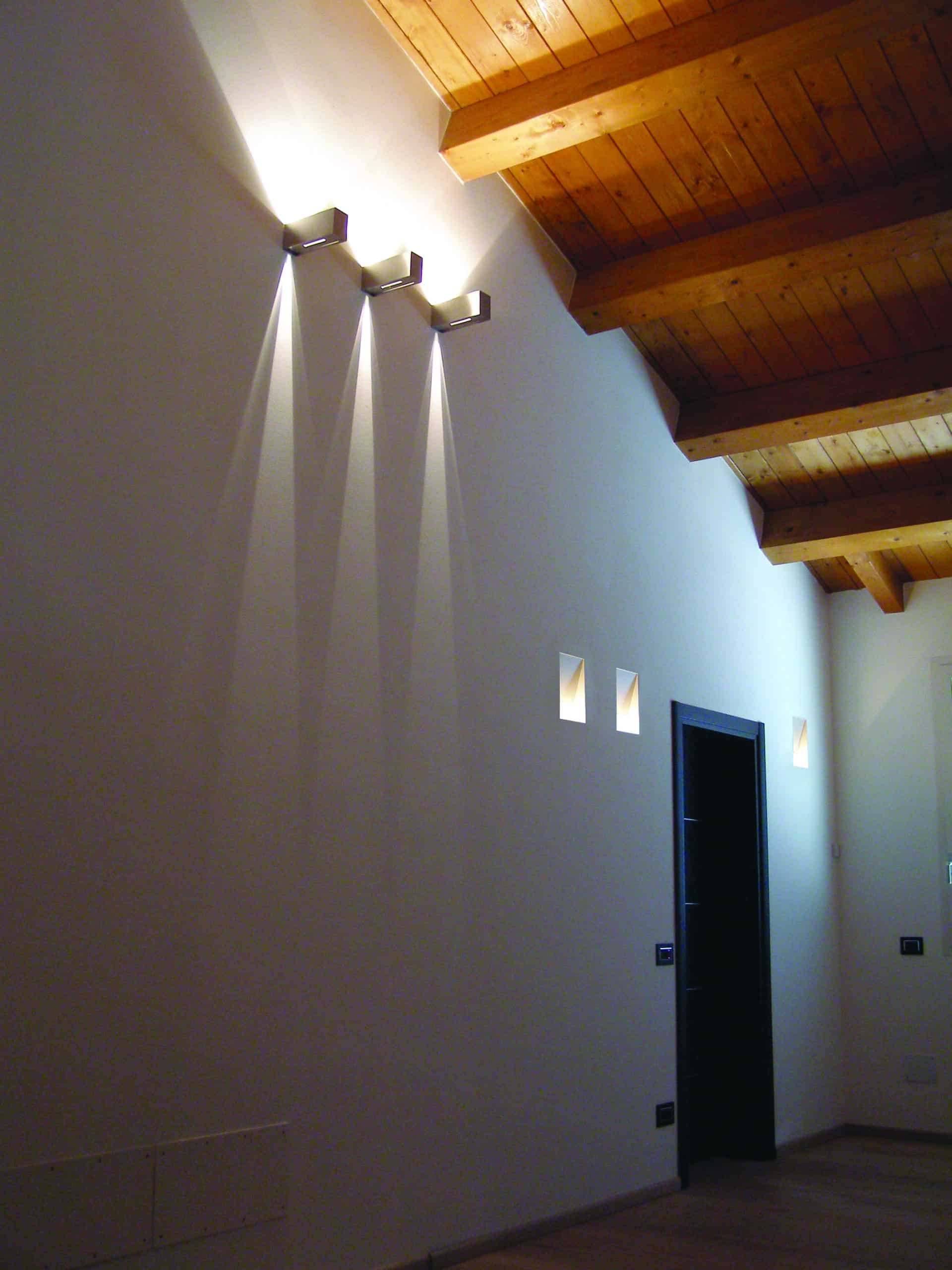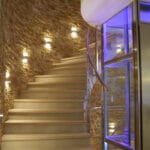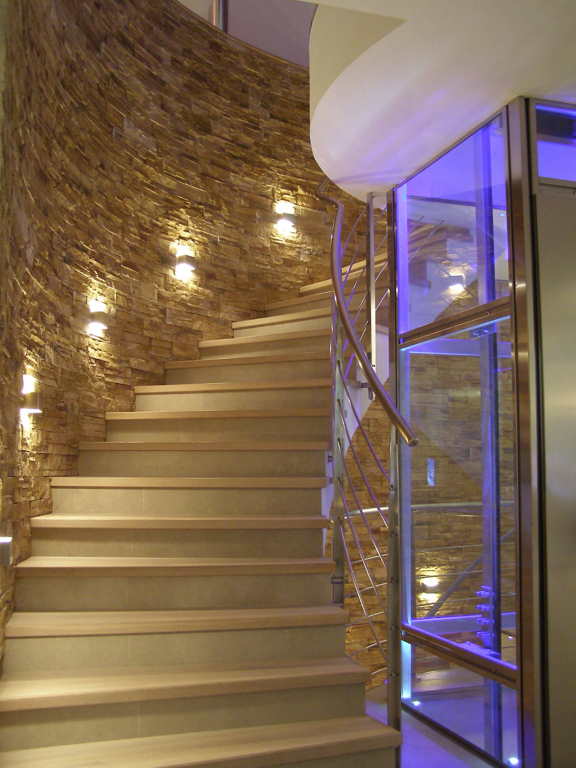 Photo: Private residence on different levels. The various rooms are customized with different types of upholstery. The choice was lighting technology that aimed at bringing out the materials while sometimes also camouflaging itself as those materials. Along the stairs, RIGO with light grazing effects emphasizes the roughness of the stone cladding of the wall. The glass elevator is lit by blue FORMAT LED lights. The RGB version of the FORMAT fixtures is utilized on the walls of the large living room to create special effects on the walls. In the living areas, WINDOW recessed fixtures were chosen, which allow users to adjust the intensity of light as needed. The same concept was used to light the kitchen with recessed INCAS 2L fixtures with mixed lamps, fluorescent and halogen. The gym is also cleverly lit with the ceiling version of the mixed lamp DUNE. The LEDs of the IN-OUT series are used in the shower, for those much needed moments of relaxation.