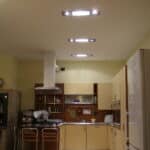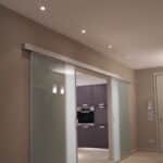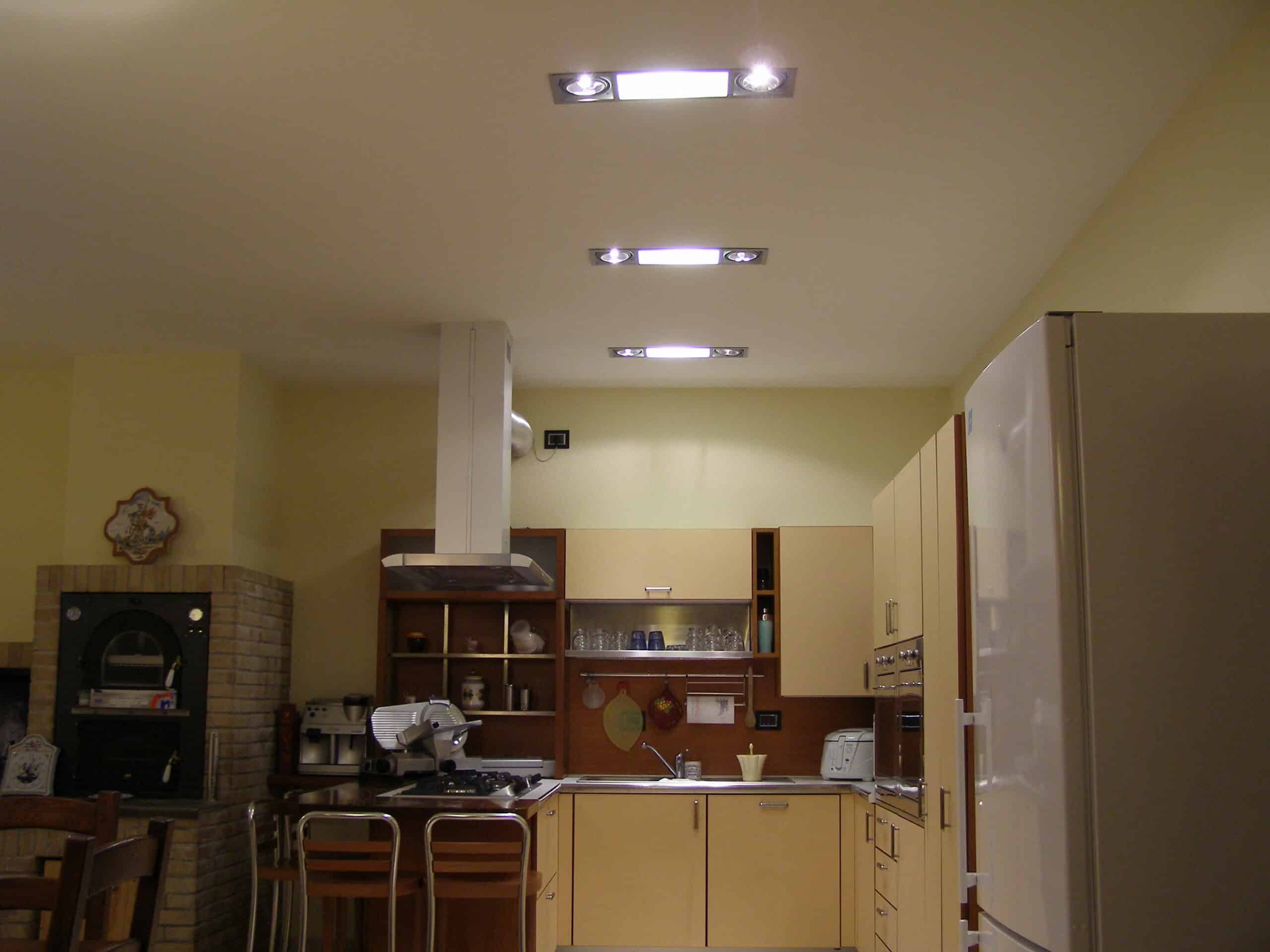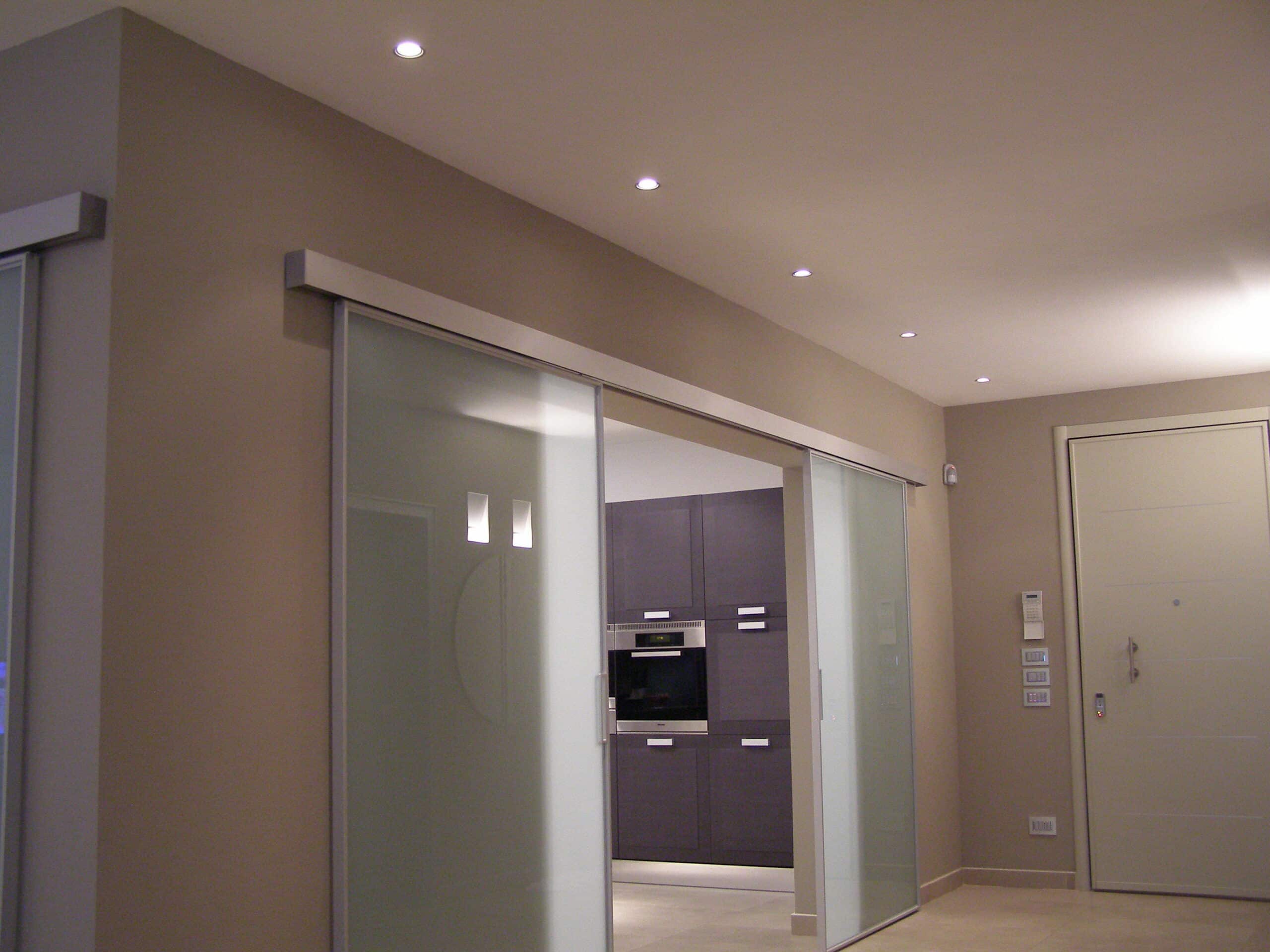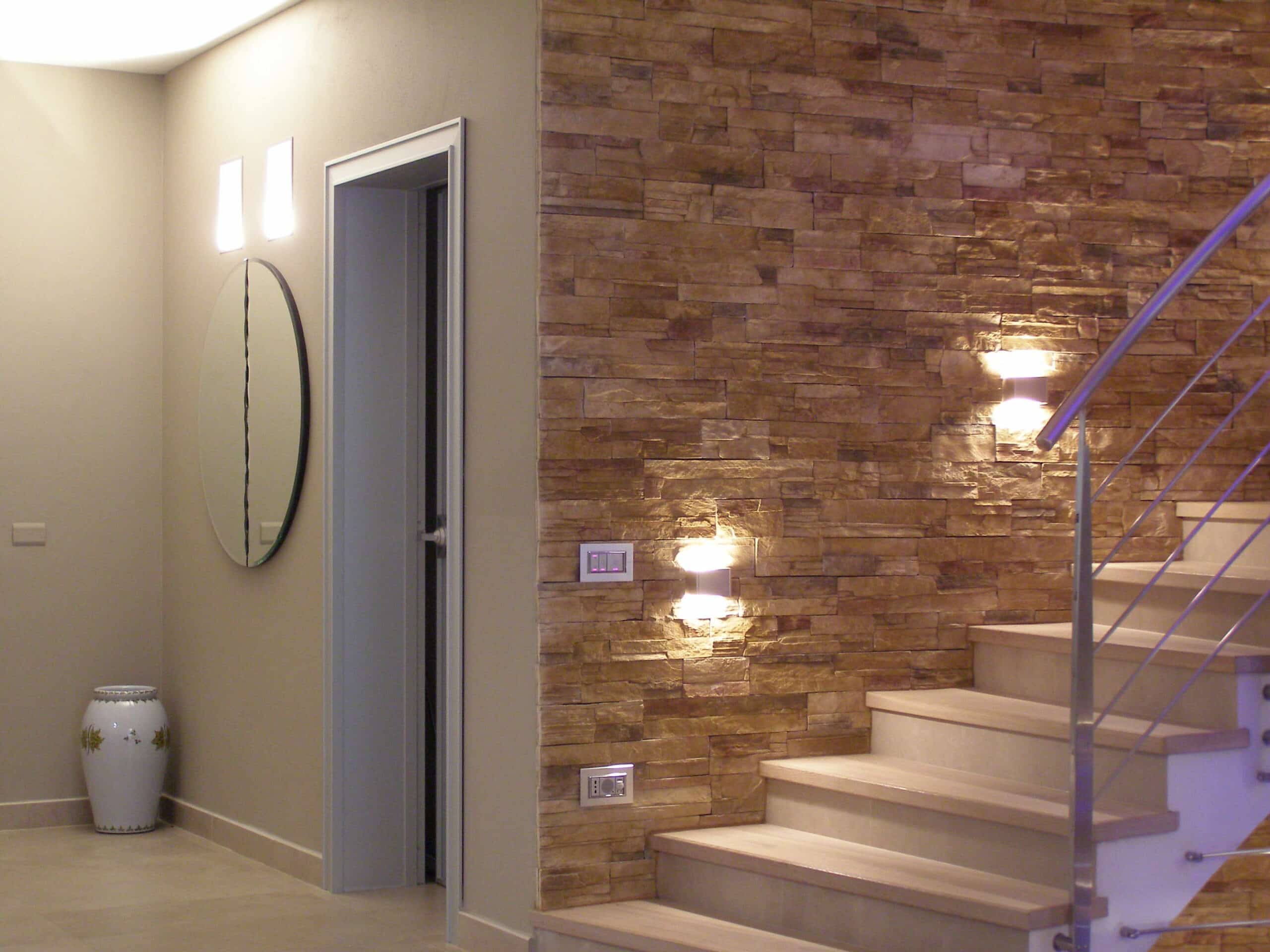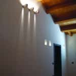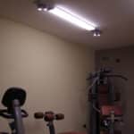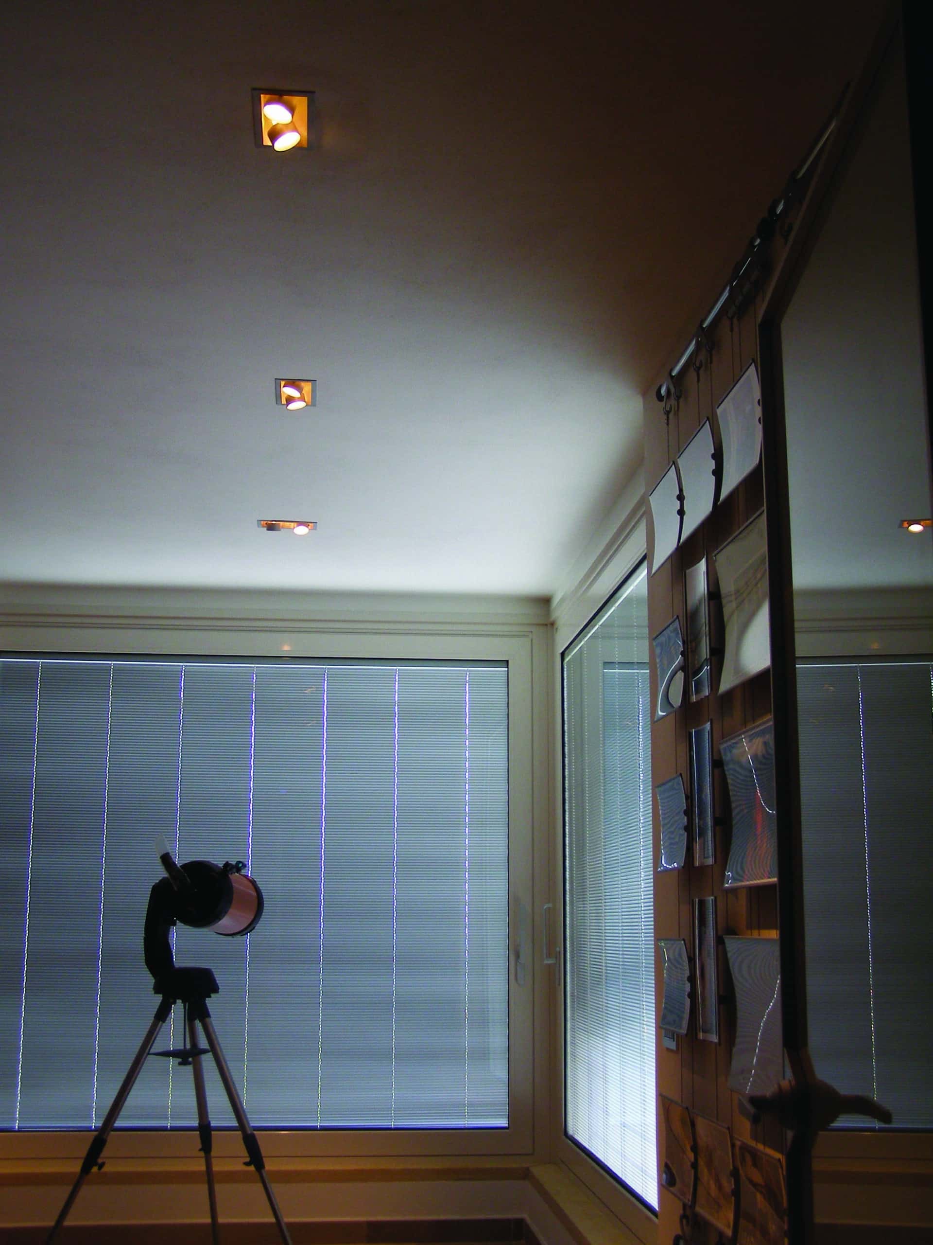 Photo: Private residence on different levels. The various rooms are customized with different types of upholstery. The choice was lighting technology that aimed at bringing out the materials while sometimes also camouflaging itself as those materials. Along the stairs, RIGO with light grazing effects emphasizes the roughness of the stone cladding of the wall. The glass elevator is lit by blue FORMAT LED lights. The RGB version of the FORMAT fixtures is utilized on the walls of the large living room to create special effects on the walls. In the living areas, WINDOW recessed fixtures were chosen, which allow users to adjust the intensity of light as needed. The same concept was used to light the kitchen with recessed INCAS 2L fixtures with mixed lamps, fluorescent and halogen. The gym is also cleverly lit with the ceiling version of the mixed lamp DUNE. The LEDs of the IN-OUT series are used in the shower, for those much needed moments of relaxation.