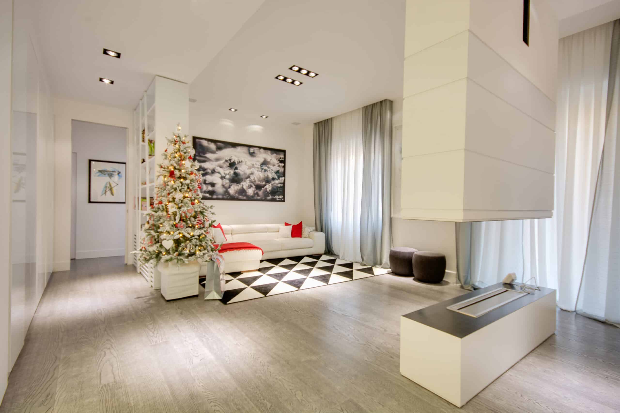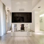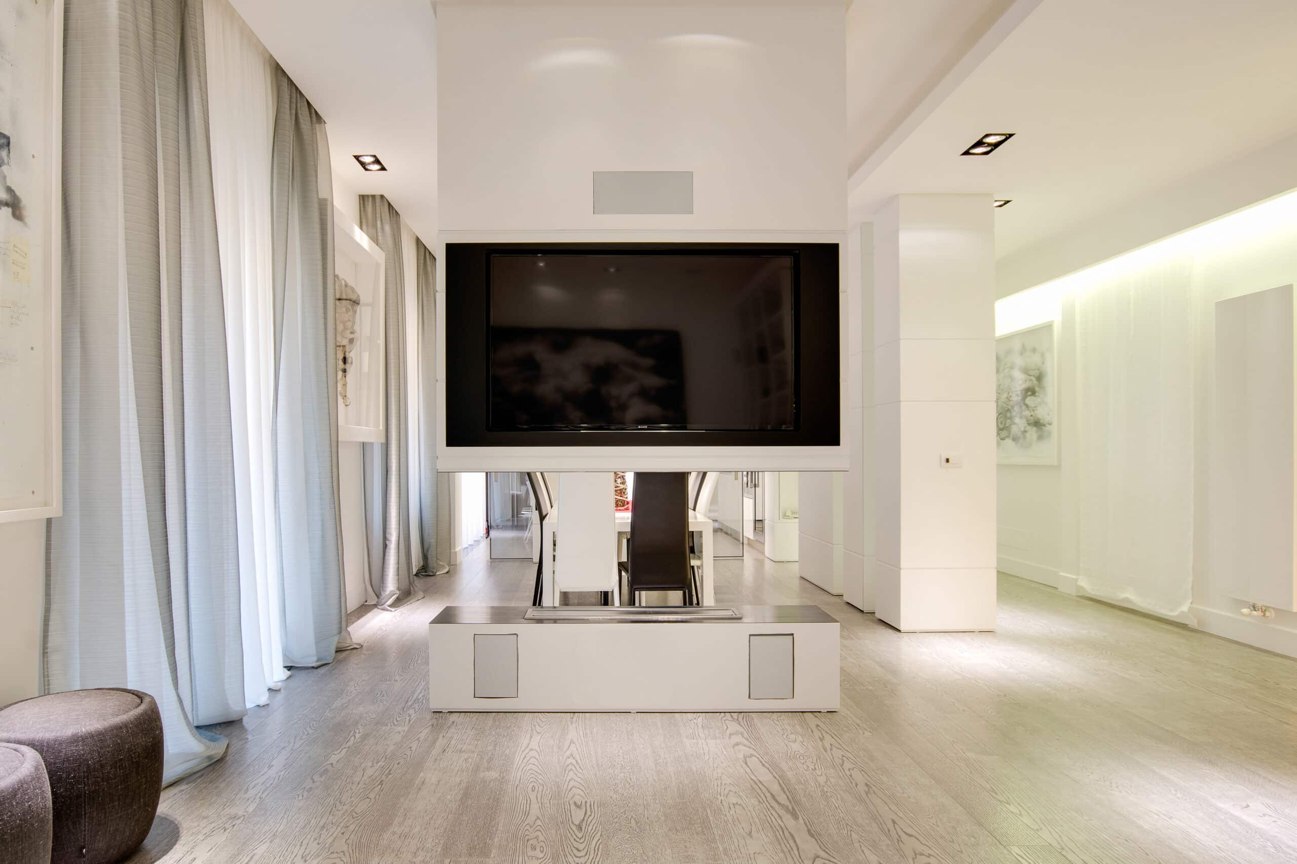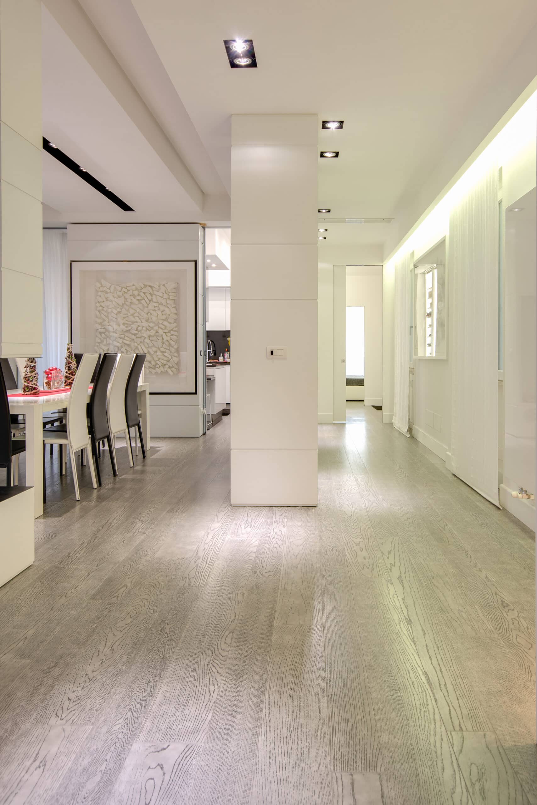 The apartment is located in a very exclusive neighbourhood of Rome. The brief was to give the house a "loft effect" where spaces were separated not by walls but by furniture. So the idea was to have a single area hosting multiple activities. As soon as you enter there is a feeling of a great bright and open space, minimalist areas and furniture and large sunny windows but everything in balance. Lighting design was very important throughout the planning of the apartment – games of shadows, chiaroscuro and bright light. The lighting becomes the focus of attention of the ceilings, deliberately black to emphasise the contrast. A recessed black line of the GUIDE series (made to measure to lead company Lucifero's design) cuts into the false ceiling over the dining table running along the 4.5 metres of the room and bending sharply vertically along the suspended volume of the tv/fireplace area. The units mounted flush with the ceiling (INCAS M) are from the same black line series and are installed in the living room and entrance, and placed at strategic points to illuminate works of art inside the apartment.