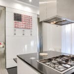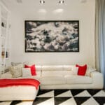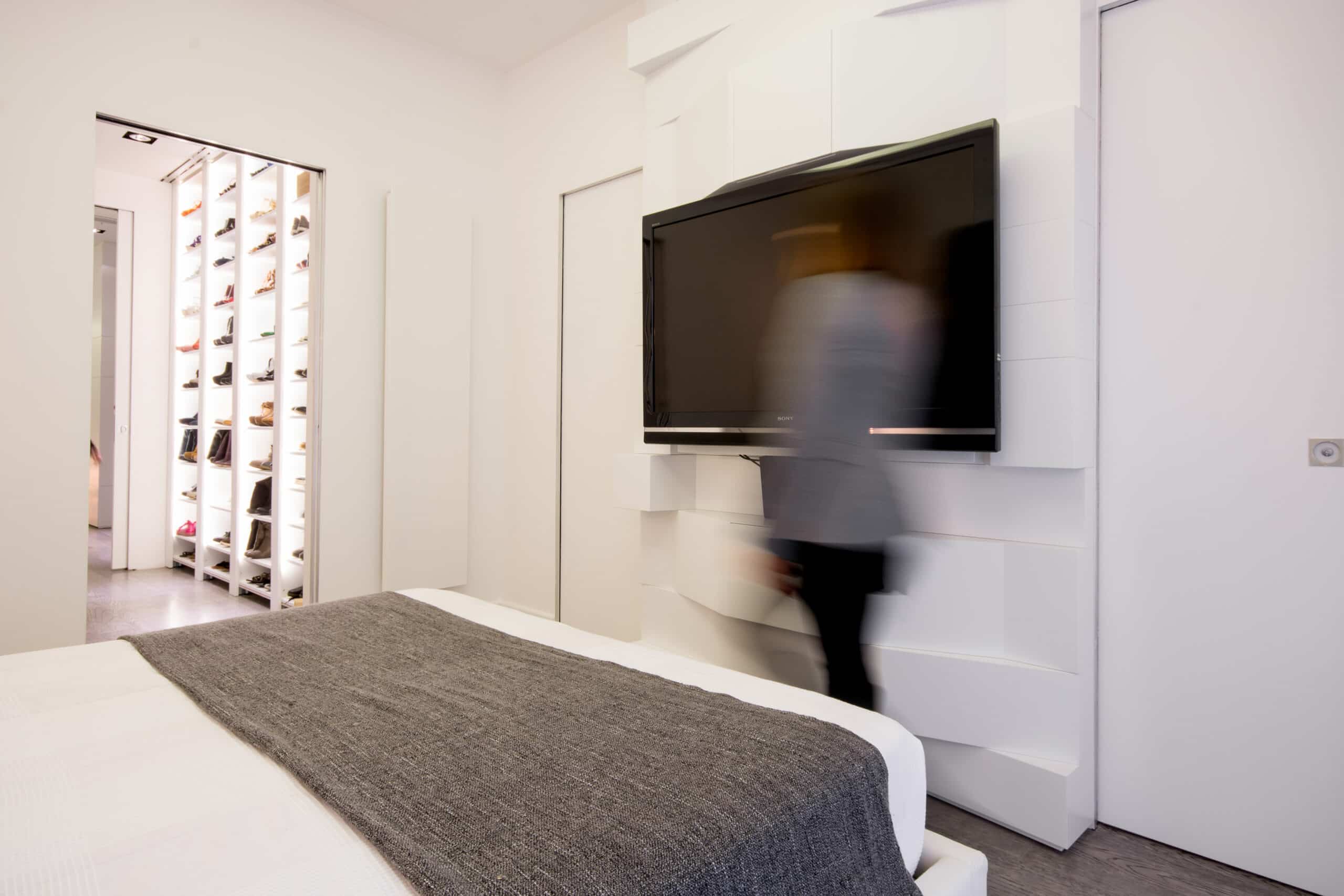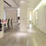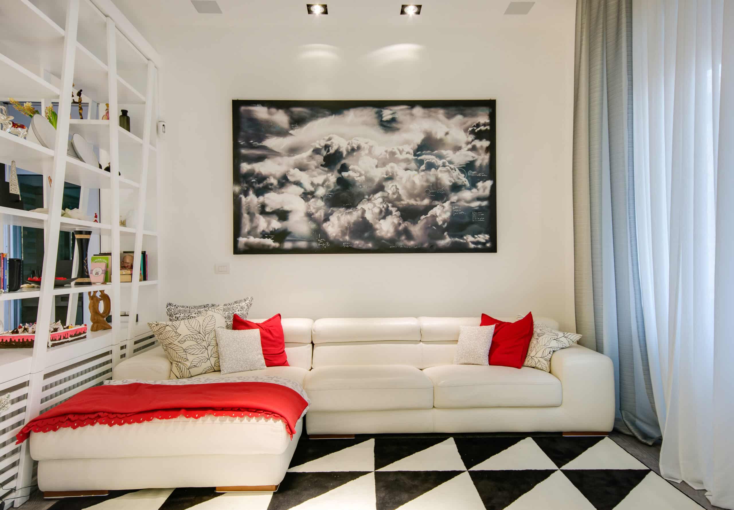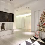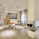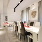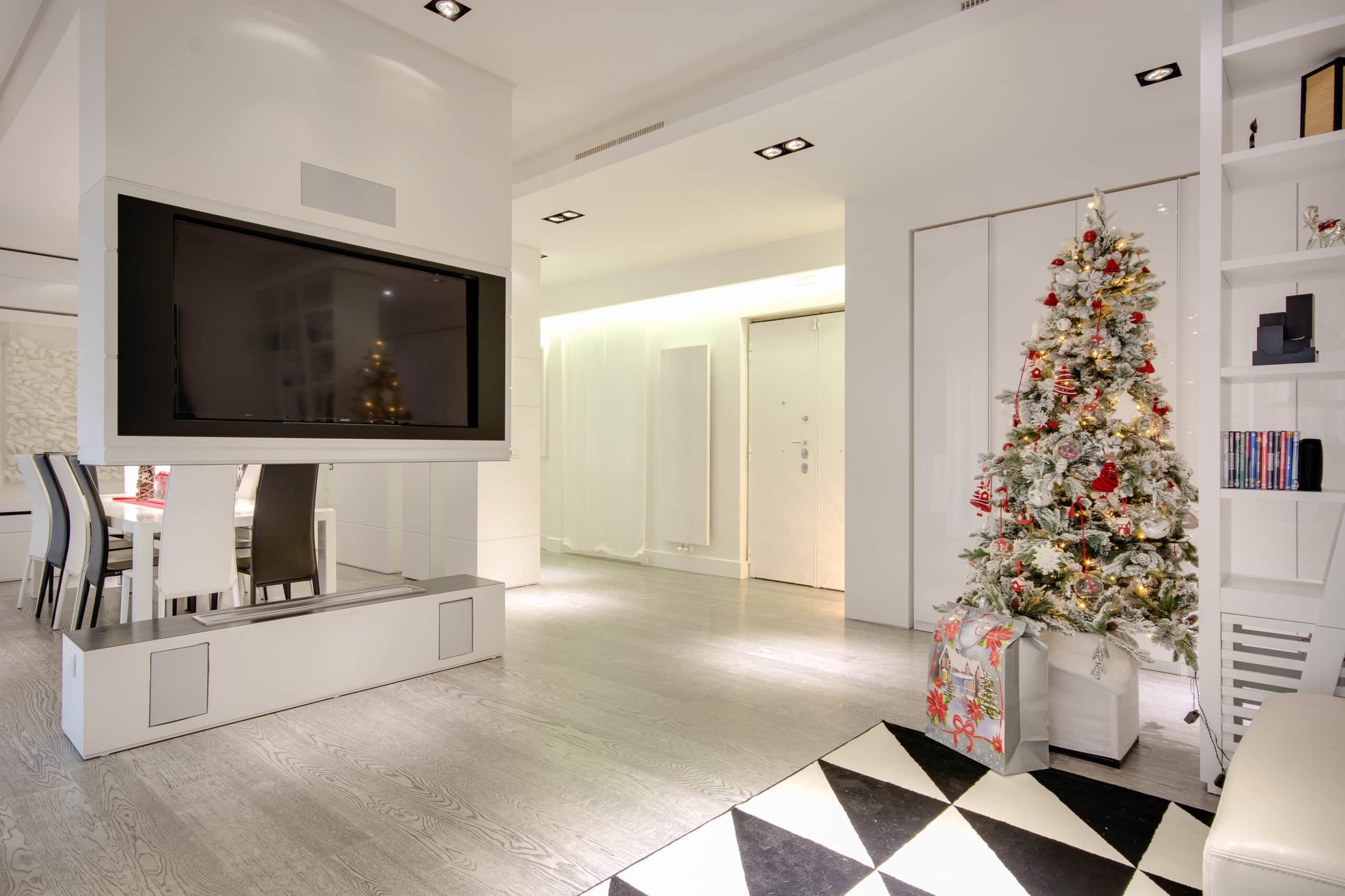 The apartment is located in a very exclusive neighbourhood of Rome. The brief was to give the house a "loft effect" where spaces were separated not by walls but by furniture. So the idea was to have a single area hosting multiple activities. As soon as you enter there is a feeling of a great bright and open space, minimalist areas and furniture and large sunny windows but everything in balance. Lighting design was very important throughout the planning of the apartment – games of shadows, chiaroscuro and bright light. The lighting becomes the focus of attention of the ceilings, deliberately black to emphasise the contrast. A recessed black line of the GUIDE series (made to measure to lead company Lucifero's design) cuts into the false ceiling over the dining table running along the 4.5 metres of the room and bending sharply vertically along the suspended volume of the tv/fireplace area. The units mounted flush with the ceiling (INCAS M) are from the same black line series and are installed in the living room and entrance, and placed at strategic points to illuminate works of art inside the apartment.