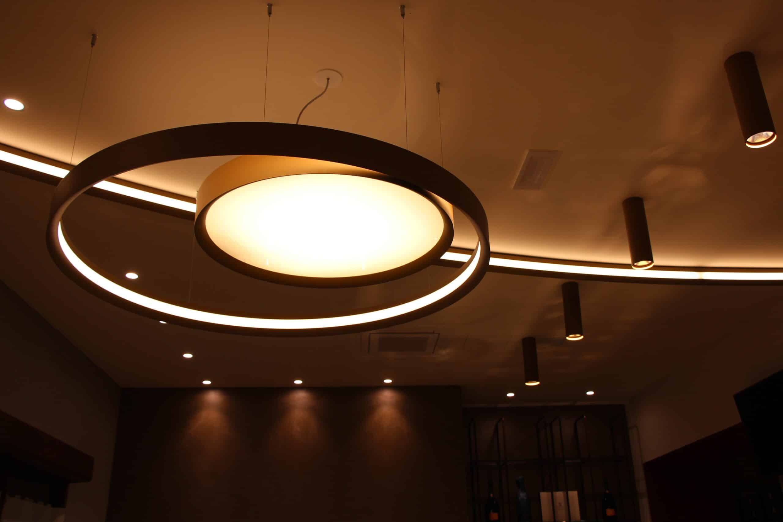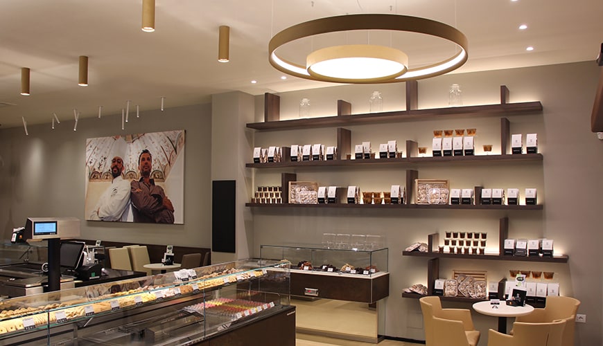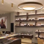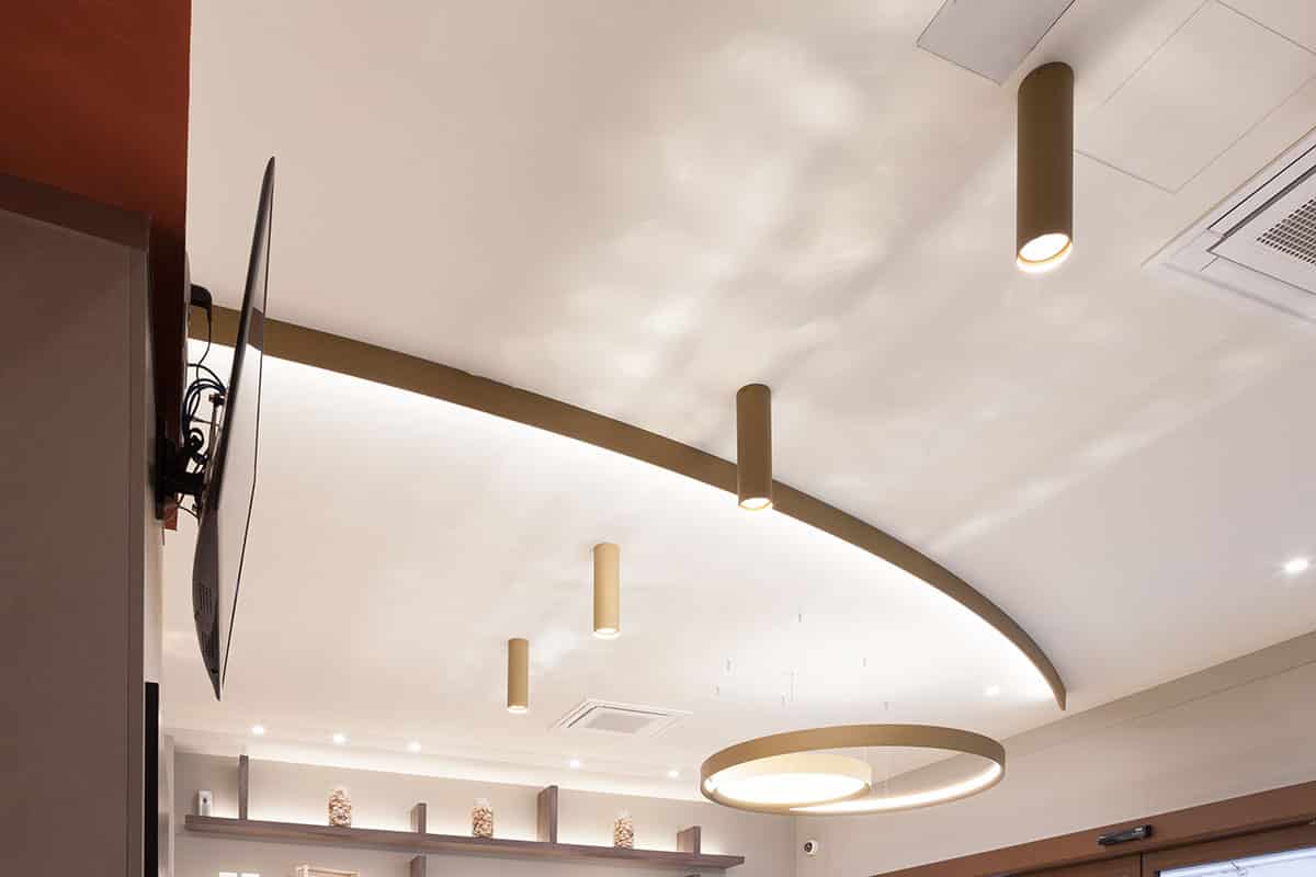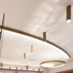 Products used: IPipedi ceiling for a targeted light and LBS ceiling version to design a curved line along the entire length of the rooms. LBS is also used in the suspended version to illuminate the display counter."