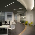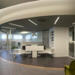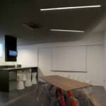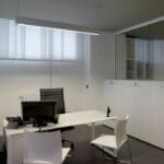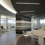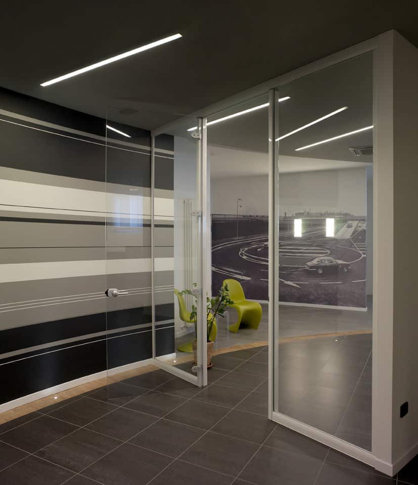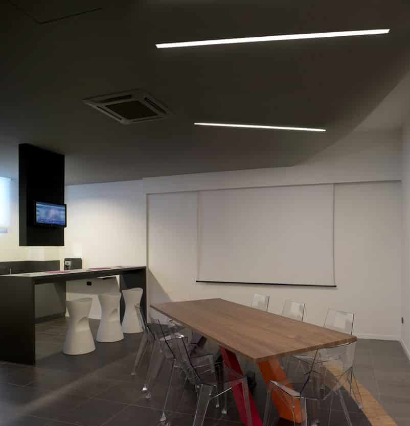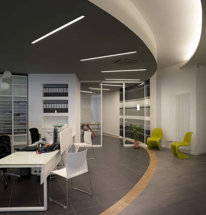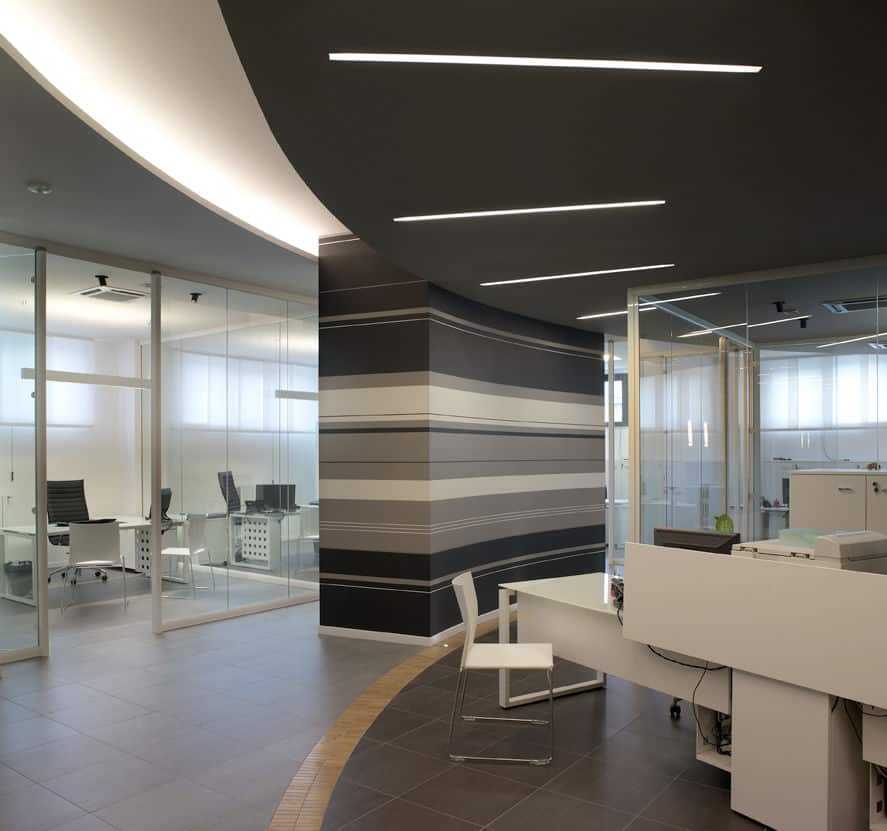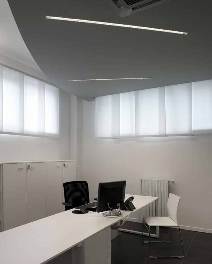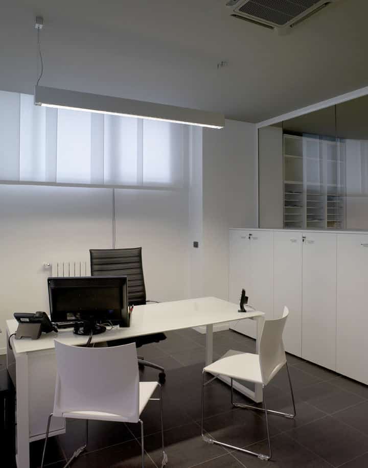 For the Dipa and Associates, a company that deals with road accidents, Architect Luca Mancini decided to shape the spaces by alternating black and white with clear crystal inserts. MINIFILE fittings, with their tiny 32mm width, were chosen in black, invisibly built-into the ceiling, which is also black. Only thin lines of artfully arranged light indicate pathways, while FILE 2H suspensions provide direct and indirect lighting in the work areas. The result is pleasant contrasting visual effects, with the whites and blacks in this rational yet at the same time friendly space.