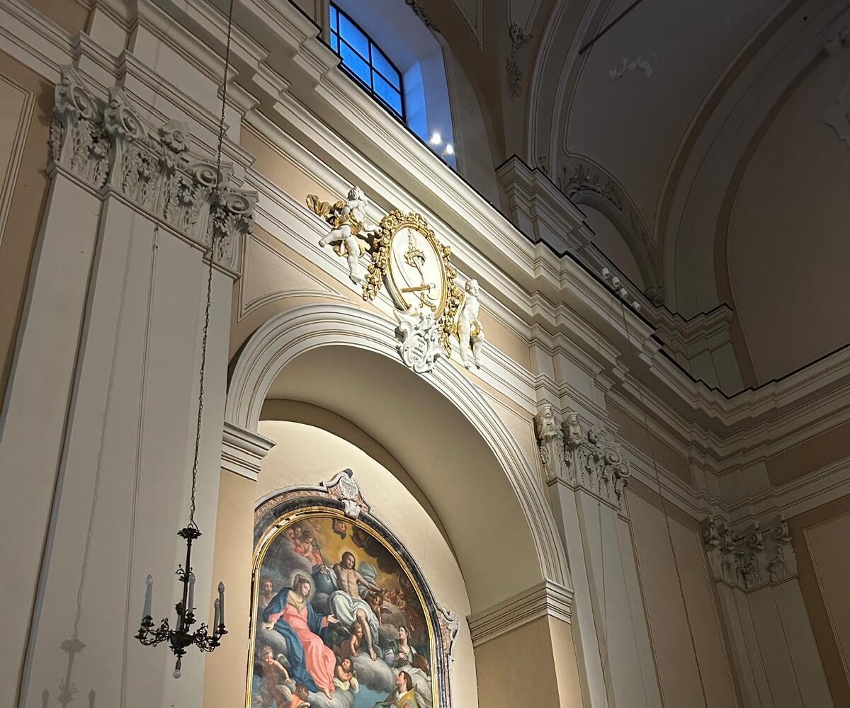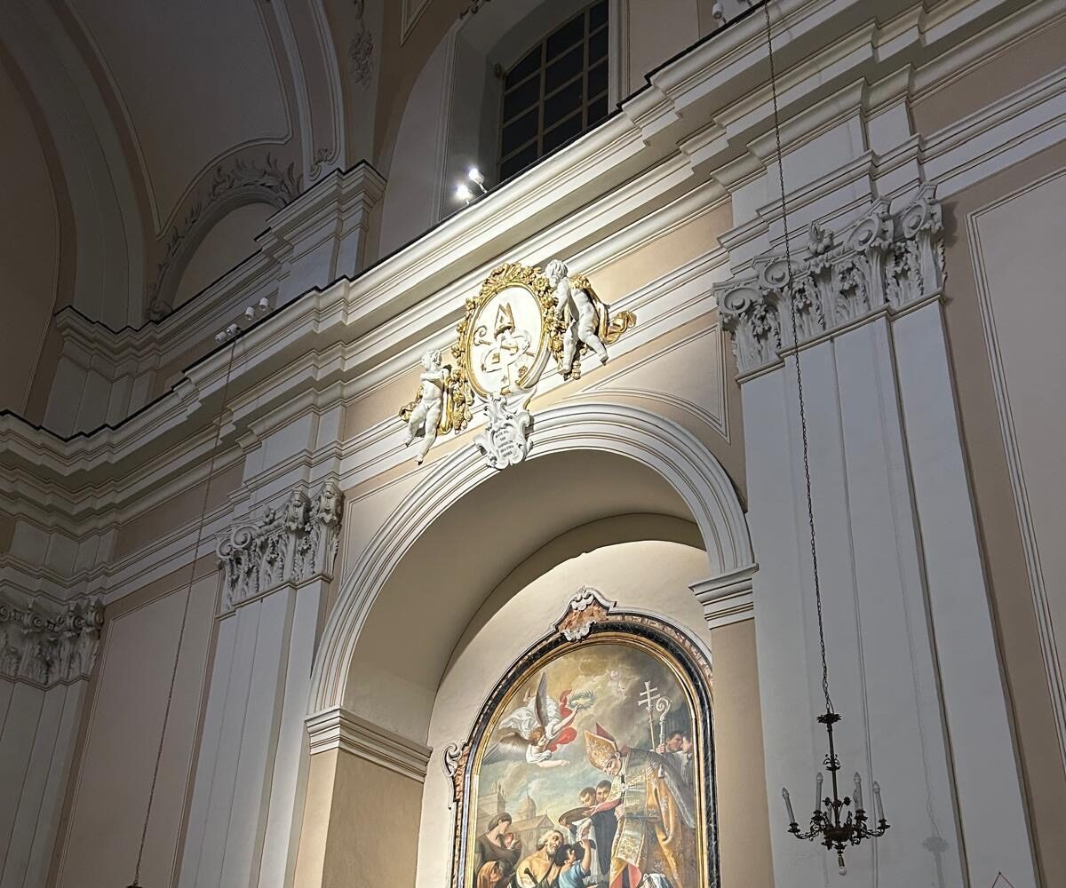 Per la recente ristrutturazione sono stati scelti i nostri Corona che con i suoi doppi proiettori, guidano lo sguardo nell’architettura della chiesa. Corona è il proiettore da appoggio per cornicioni che con discrezione illumina ed emoziona il fedele senza essere mai protagonista assoluto. E’ capace di creare atmosfere divere a seconda della scelta delle lenti e del colore dei led.